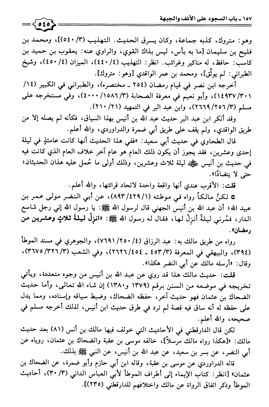 • لكنَّ مالكًا رواه في موطئه (١/ ٤٢٩/ ٨٩٣)، عن أبي النضر مولى عمر بن عبيد الله؛ أن عبد الله بن أنيس الجهني قال لرسول الله - صلى الله عليه وسلم -: يا رسول الله إني رجل شاسع الدار، فمُرني ليلةً أنزِلُ لها، فقال له رسول الله - صلى الله عليه وسلم -: "انزِلْ ليلةَ ثلاثٍ وعشرين من رمضان".