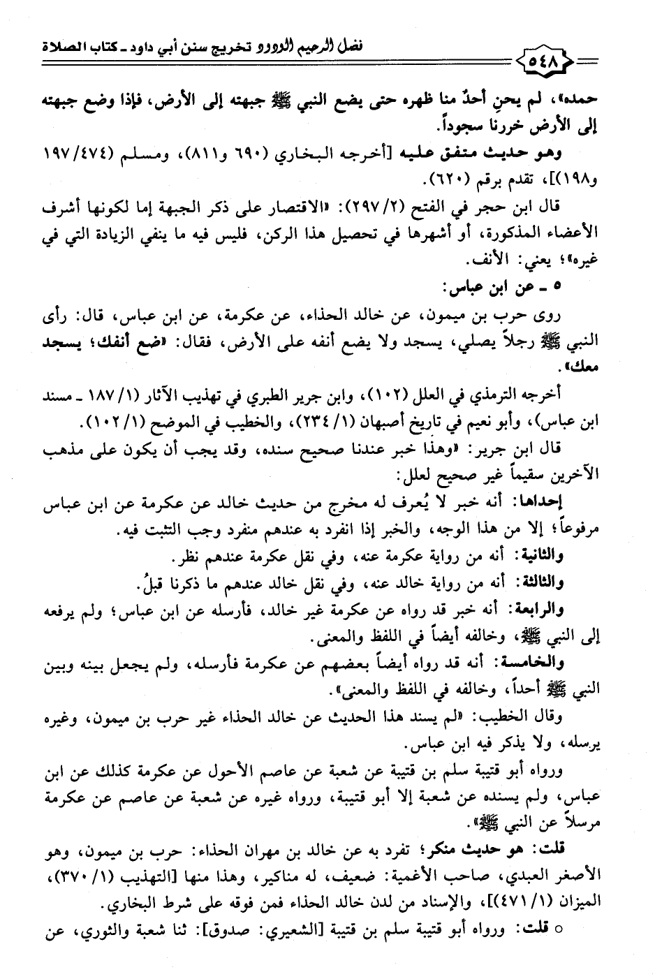 روى حرب بن ميمون، عن خالد الحذاء، عن عكرمة، عن ابن عباس، قال: رأى النبي - صلى الله عليه وسلم - رجلًا يصلي، يسجد ولا يضع أنفه على الأرض، فقال: "ضع أنفك؛ يسجد معك".