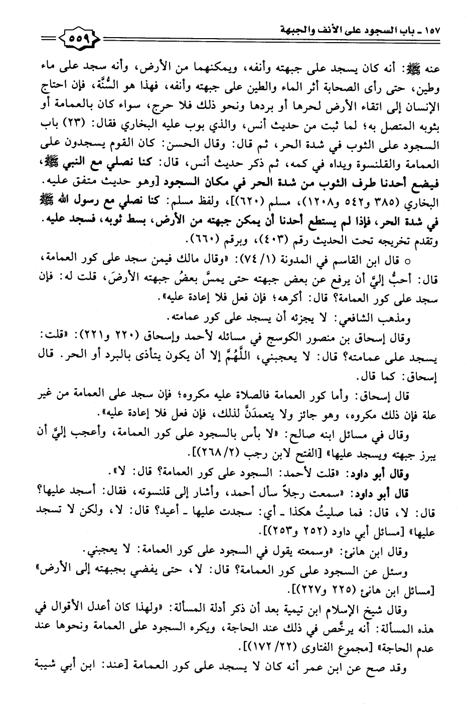 وقال شيخ الإسلام ابن تيمية بعد أن ذكر أدلة المسألة: "ولهذا كان أعدل الأقوال في هذه المسألة: أنه يرخَّص في ذلك عند الحاجة، ويكره السجود على العمامة ونحوها عند عدم الحاجة" [مجموع الفتاوى (٢٢/ ١٧٢)].