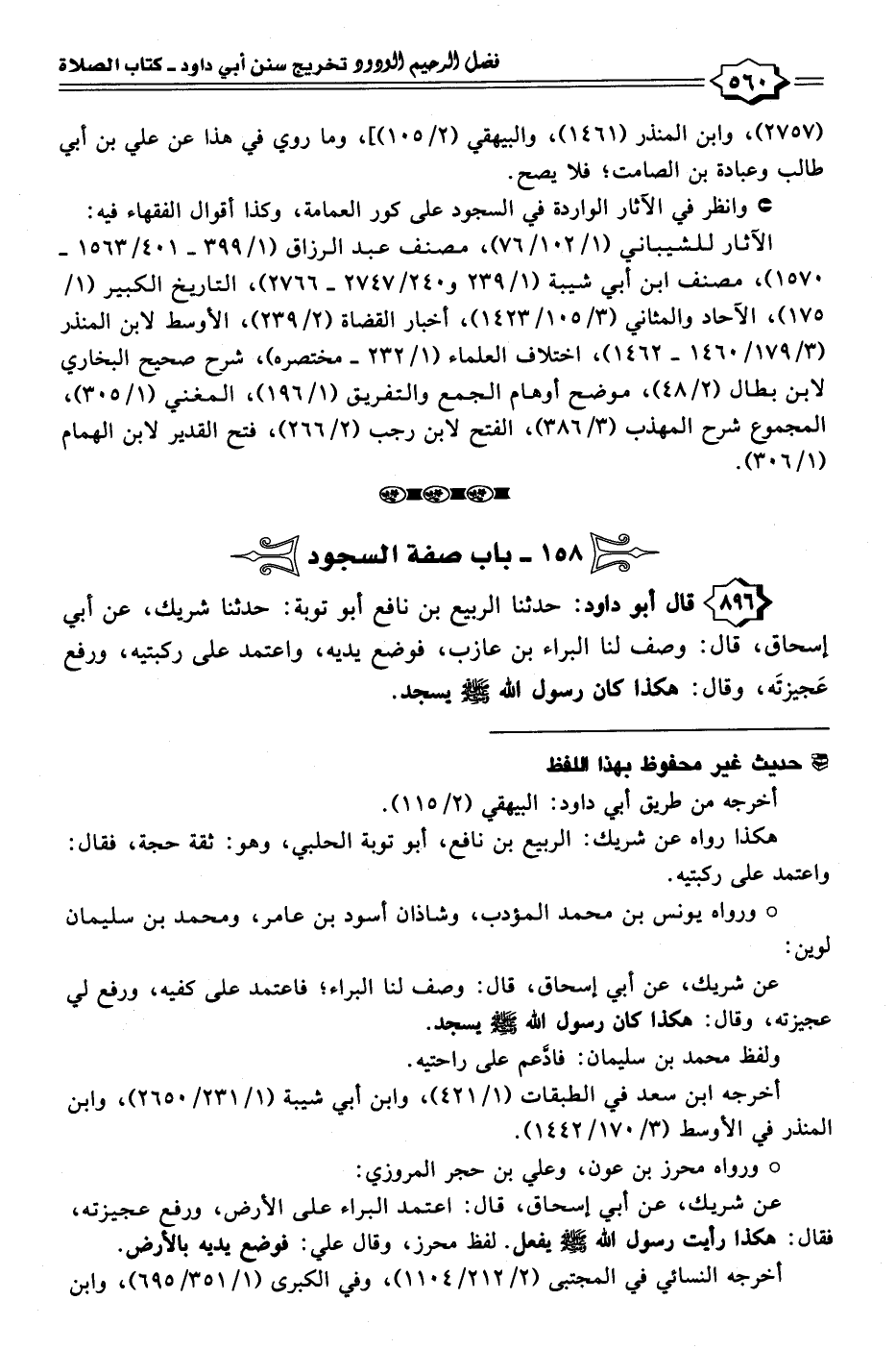 ٨٩٦ - قال أبو داود: حدثنا الربيع بن نافع أبو توبة: حدثنا شريك، عن أبي إسحاق، قال: وصف لنا البراء بن عازب، فوضع يديه، واعتمد على ركبتيه، ورفع عَجيزتَه، وقال: هكذا كان رسول الله - صلى الله عليه وسلم - يسجد.