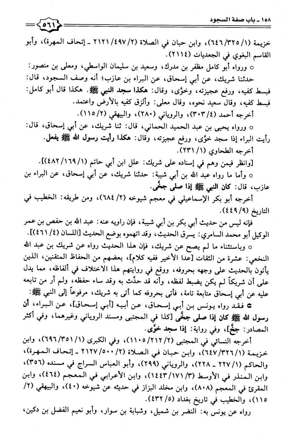 • ورواه أبو كامل مظفر بن مدرك، وسعيد بن سليمان الواسطي، ومعلى بن منصور: حدثنا شريك، عن أبي إسحاق، عن البراء بن عازب؛ أنه وصف السجود، قال: فبسط كفيه، ورفع عجيزته، وخوَّى، وقال: هكذا سجد النبي - صلى الله عليه وسلم -. هكذا قال أبو كامل: فبسط كفيه، وقال سعيد نحوه، وقال معلى: وألزق كفيه بالأرض واعتمد.