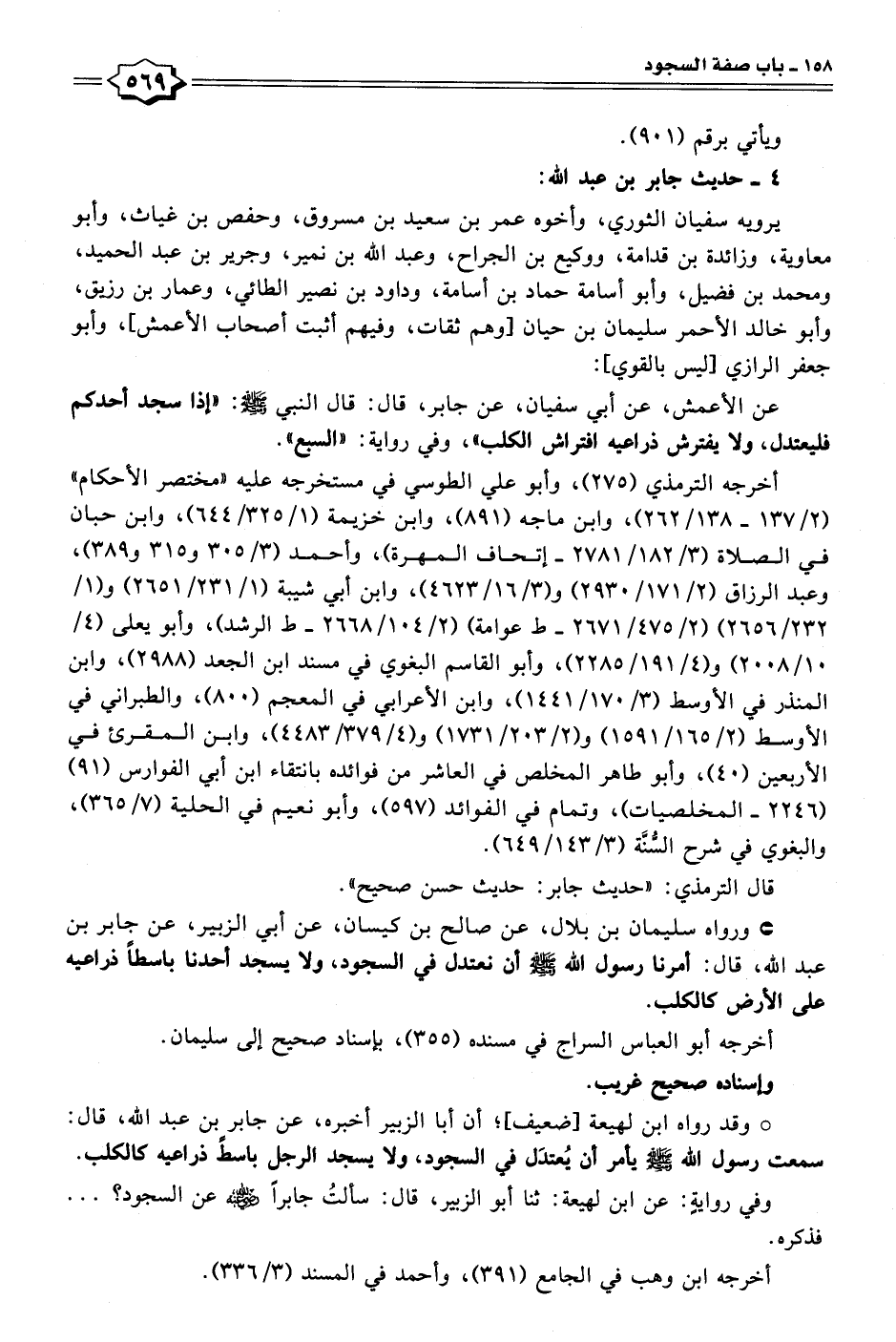 • ورواه سليمان بن بلال، عن صالح بن كيسان، عن أبي الزبير، عن جابر بن عبد الله، قال: أمرنا رسول الله - صلى الله عليه وسلم - أن نعتدل في السجود، ولا يسجد أحدنا باسطًا ذراعيه على الأرض كالكلب.