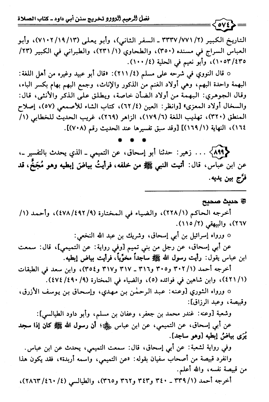 ٨٩٩ - . . . زهير: حدثنا أبو إسحاق، عن التميمي - الذي يحدث بالتفسير -، عن ابن عباس، قال: أتيت النبي - صلى الله عليه وسلم - من خلفه، فرأيتُ بياضَ إبطيه وهو مُجَخٍّ، قد فرَّج بين يديه.