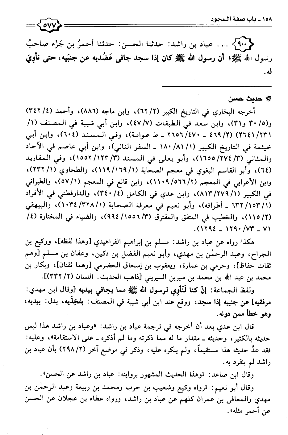 ٩٠٠ - . . . عباد بن راشد: حدثنا الحسن: حدثنا أحمرُ بن جَزْء صاحبُ رسول الله - صلى الله عليه وسلم -؛ أن رسول الله - صلى الله عليه وسلم - كان إذا سجد جافى عَضُديه عن جنبَيه، حتى نأوِيَ له.