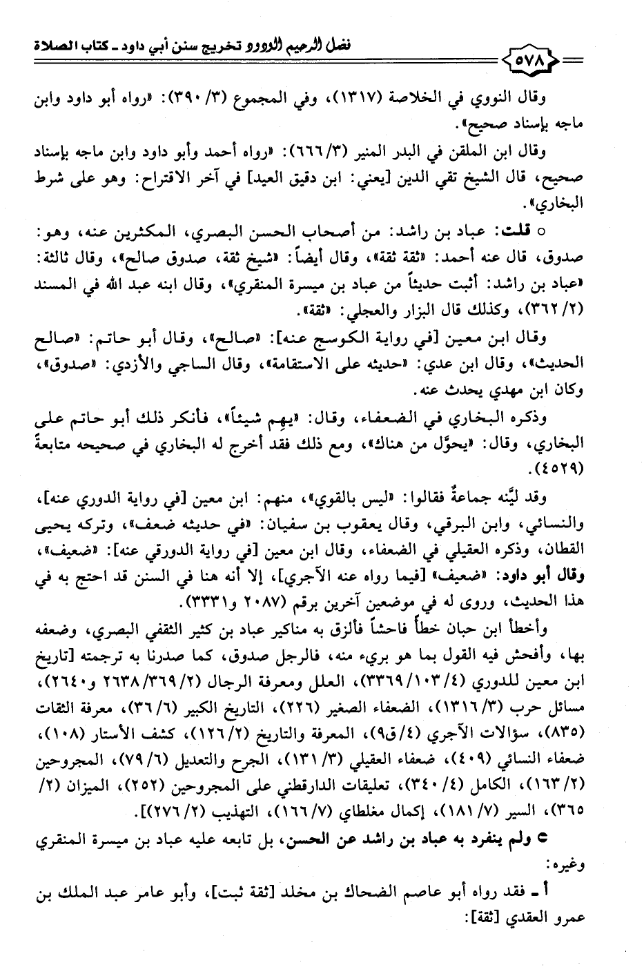 • قلت: عباد بن راشد: من أصحاب الحسن البصري، المكثرين عنه، وهو: صدوق، قال عنه أحمد: "ثقة ثقة"، وقال أيضًا: "شيخ ثقة، صدوق صالح"، وقال ثالثة: "عباد بن راشد: أثبت حديثًا من عباد بن ميسرة المنقري"، وقال ابنه عبد الله في المسند (٢/ ٣٦٢)، وكذلك قال البزار والعجلي: "ثقة".