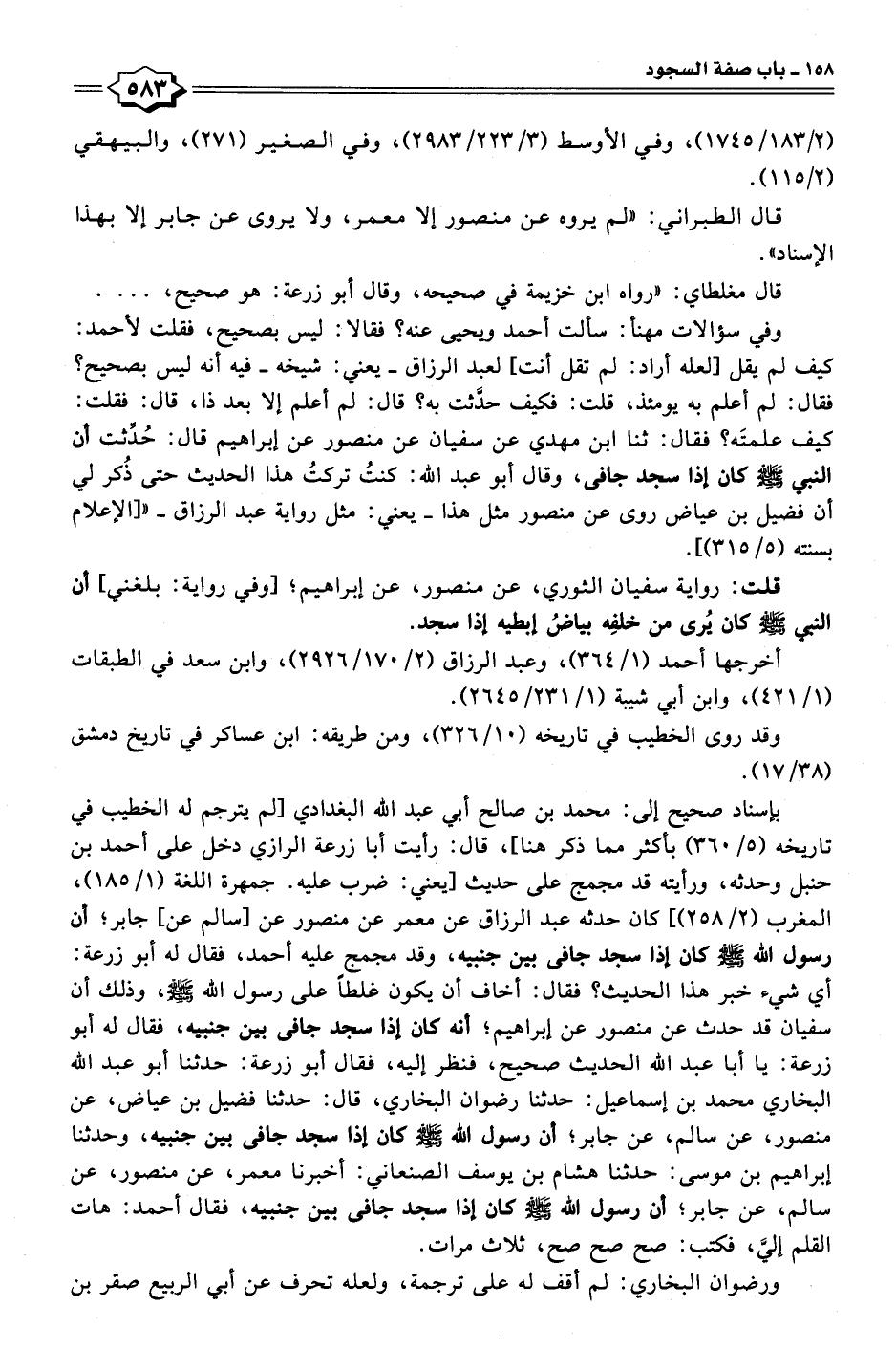 قال مغلطاي: "رواه ابن خزيمة في صحيحه، وقال أبو زرعة: هو صحيح، وفي سؤالات مهنا: سألت أحمد ويحيى عنه؟ فقالا: ليس بصحيح، فقلت لأحمد: كيف لم يقل [لعله أراد: لم تقل أنت] لعبد الرزاق -يعني: شيخه- فيه أنه ليس بصحيح؟ فقال: لم أعلم به يومئذ، قلت: فكيف حدَّثت به؟ قال: لم أعلم إلا بعد ذا، قال: فقلت: كيف علمتَه؟ فقال: ثنا ابن مهدي عن سفيان عن منصور عن إبراهيم قال: حُدِّثت أن النبي - صلى الله عليه وسلم - كان إذا سجد جافى، وقال أبو عبد الله: كنتُ تركتُ هذا الحديث حتى ذُكر لي أن فضيل بن عياض روى عن منصور مثل هذا -يعني: مثل رواية عبد الرزاق-: " [الإعلام بسنته (٥/ ٣١٥)].