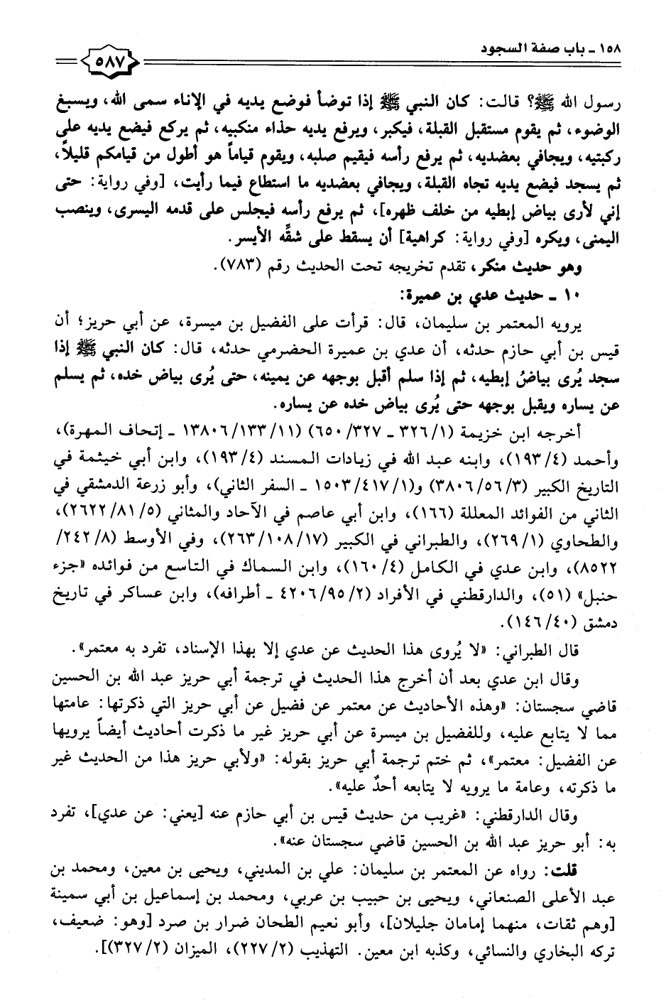 يرويه المعتمر بن سليمان، قال: قرأت على الفضيل بن ميسرة، عن أبي حريز؛ أن قيس بن أبي حازم حدثه، أن عدي بن عميرة الحضرمي حدثه، قال: كان النبي - صلى الله عليه وسلم - إذا سجد يُرى بياضُ إبطيه، ثم إذا سلم أقبل بوجهه عن يمينه، حتى يُرى بياض خده، ثم يسلم عن يساره ويقبل بوجهه حتى يُرى بياض خده عن يساره.
