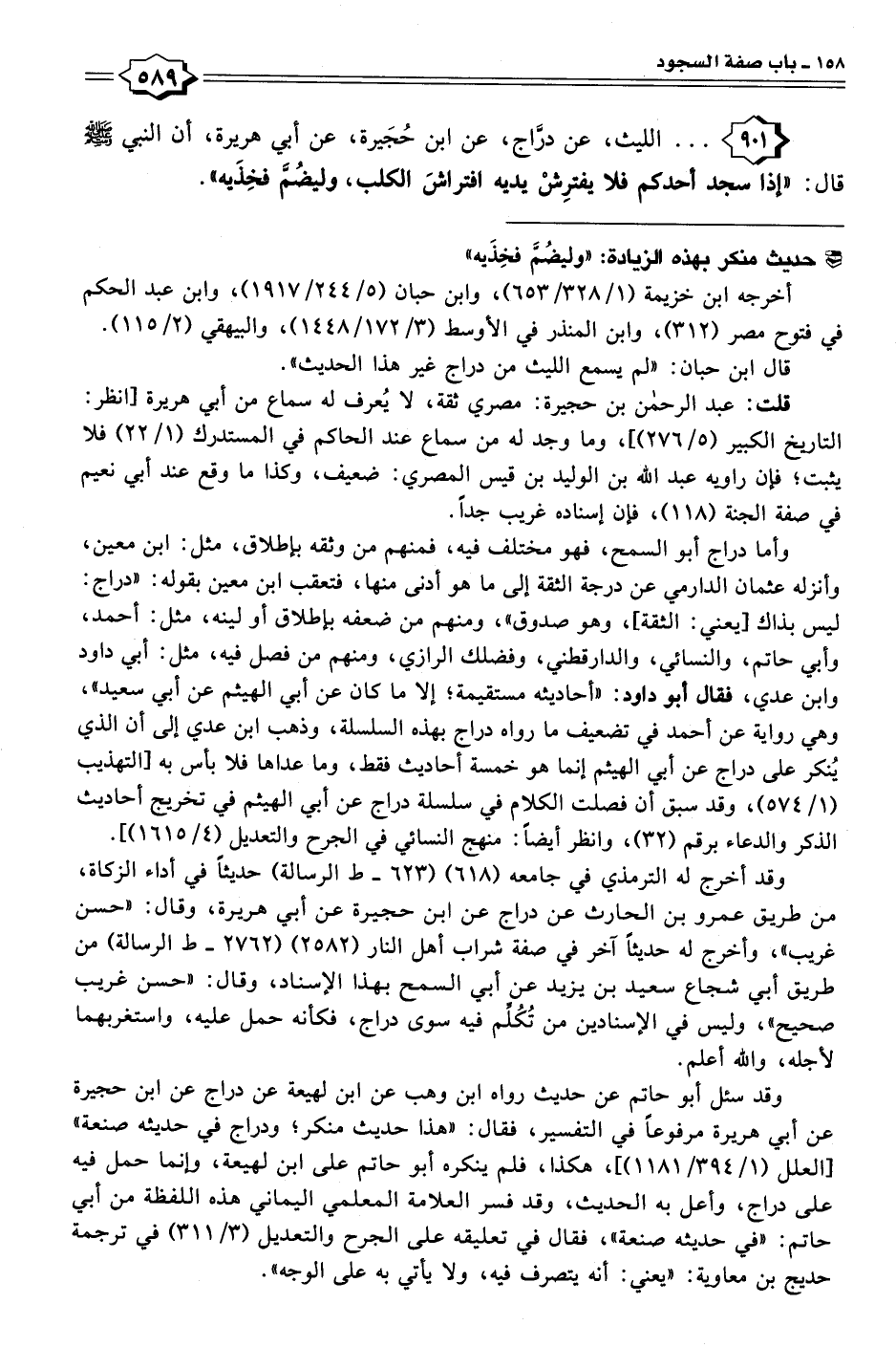 ٩٠١ - . . . الليث، عن درَّاج، عن ابن حُجَيرة، عن أبي هريرة، أن النبي - صلى الله عليه وسلم - قال: "إذا سجد أحدكم فلا يفترِشْ يديه افتراشَ الكلب، وليضُمَّ فخِذَيه".