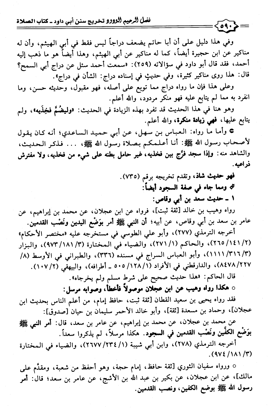 رواه وهيب بن خالد [ثقة ثبت]، فرواه عن ابن عجلان، عن محمد بن إبراهيم، عن عامر بن سعد بن أبي وقاص، عن أبيه؛ أن النبي - صلى الله عليه وسلم - أمر بوَضْع اليدين ونَصْب القدمين.