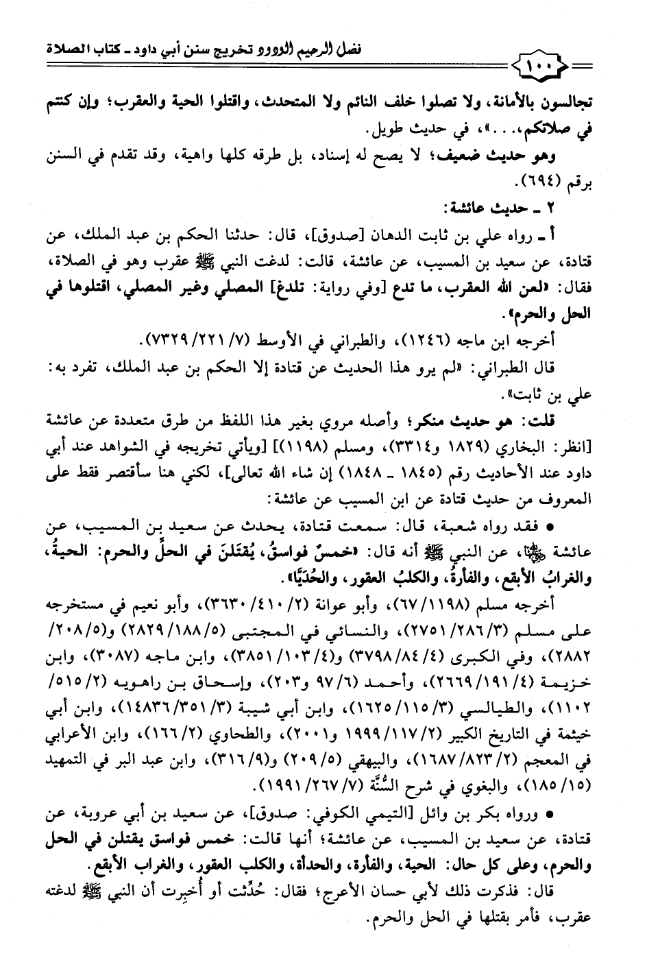 أ- رواه علي بن ثابت الدهان [صدوق]، قال: حدثنا الحكم بن عبد الملك، عن قتادة، عن سعيد بن المسيب، عن عائشة، قالت: لدغت النبي - صلى الله عليه وسلم - عقرب وهو في الصلاة، فقال: "لعن الله العقرب، ما تدع [وفي رواية: تلدغ] المصلي وغير المصلي، اقتلوها في الحل والحرم".
