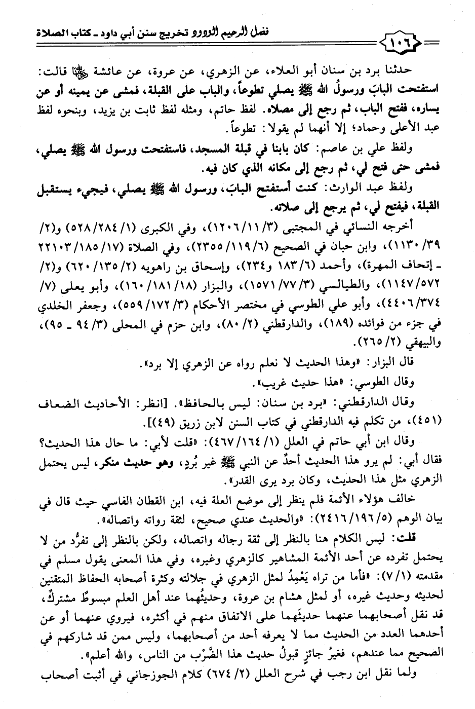 حدثنا برد بن سنان أبو العلاء، عن الزهري، عن عروة، عن عائشة - رضي الله عنها - قالت: استفتحت البابَ ورسولُ الله - صلى الله عليه وسلم - يصلي تطوعًا، والباب على القبلة، فمشى عن يمينه أو عن يساره، ففتح الباب، ثم رجع إلى مصلاه. لفظ حاتم، ومثله لفظ ثابت بن يزيد، وبنحوه لفظ عبد الأعلى وحماد؛ إلا أنهما لم يقولا: تطوعًا.