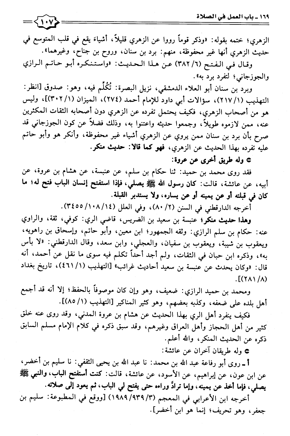 فقد روى محمَّد بن حميد: ثنا حكام بن سلم، عن عنبسة، عن هشام بن عروة، عن أبيه، عن عائشة، قالت: كان رسول الله - صلى الله عليه وسلم - يصلي، فإذا استفتح إنسان الباب فتح له؛ ما كان في قبلته أو عن يمينه أو عن يساره، ولا يستدبر القبلة.