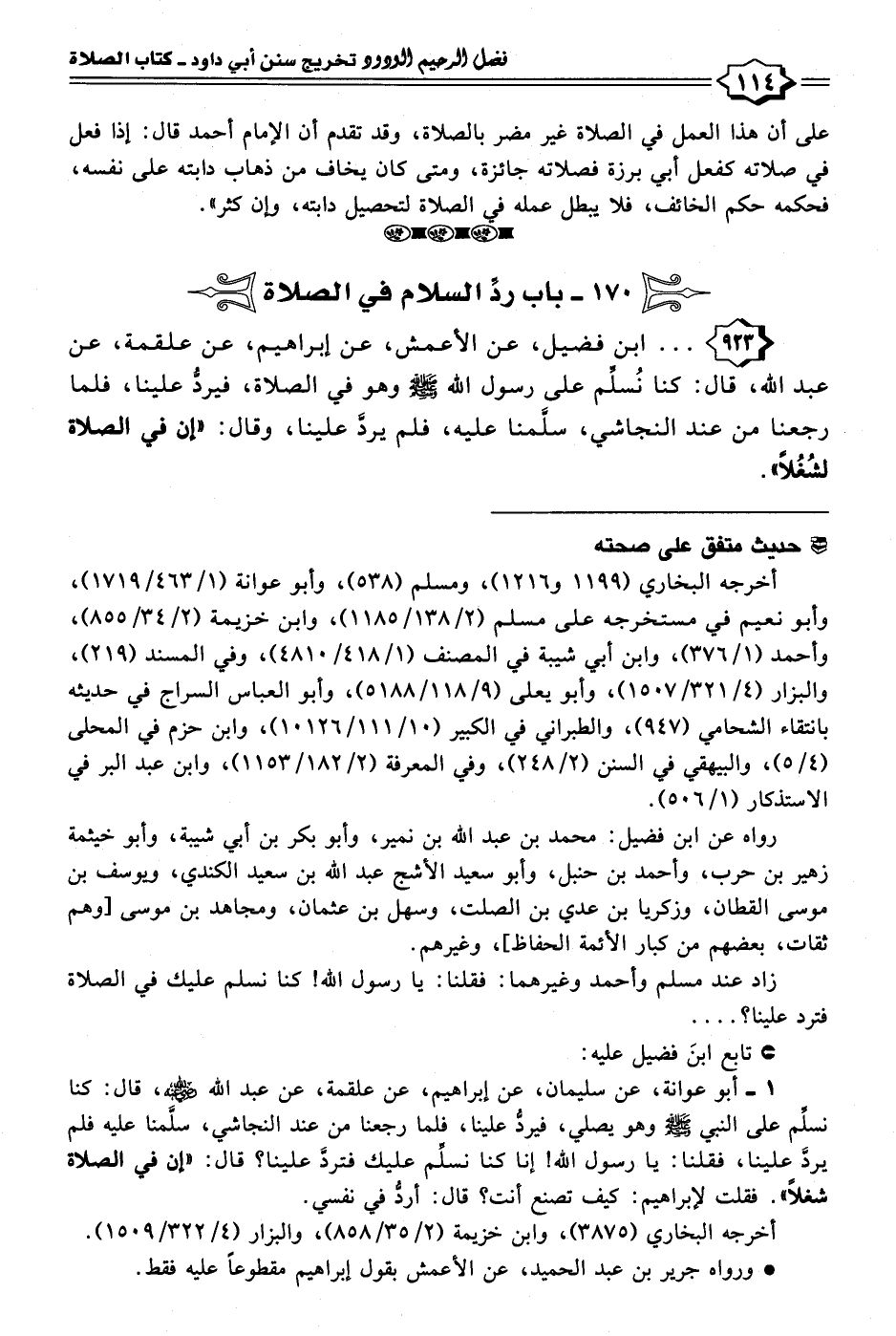 ١ - أبو عوانة، عن سليمان، عن إبراهيم، عن علقمة، عن عبد الله - رضي الله عنه -، قال: كنا نسلِّم على النبي - صلى الله عليه وسلم - وهو يصلي، فيردُّ علينا، فلما رجعنا من عند النجاشي، سلَّمنا عليه فلم يردَّ علينا، فقلنا: يا رسول الله! إنا كنا نسلِّم عليك فتردَّ علينا؟ قال: "إن في الصلاة شغلًا". فقلت لإبراهيم: كيف تصنع أنت؟ قال: أردُّ في نفسي.