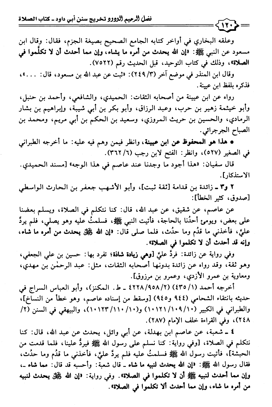 ٤ - شعبة، عن عاصم بن بهدلة، عن أبي وائل، يحدث عن عبد الله، قال: كنا نتكلم في الصلاة، [وفي رواية: كنا نسلم على رسول الله - صلى الله عليه وسلم - فيرد علينا، فلما قدمت من الحبشة]، فأتيت رسول الله - صلى الله عليه وسلم - فسلمتُ عليه فلم يردَّ عليَّ، فأخذني ما قدُم وما حدُث، فقال رسول الله - صلى الله عليه وسلم -: "إن الله يحدث لنبيه ما شاء -قال شعبة: وأحسبه قد قال: مما شاء-، وإن مما أحدث لنبيه - صلى الله عليه وسلم - أن لا تكلموا في الصلاة". وفي رواية: "إن الله عز وجل يحدث لنبيه من أمره ما شاء، وإن مما أحدث ألا تكلموا في الصلاة".