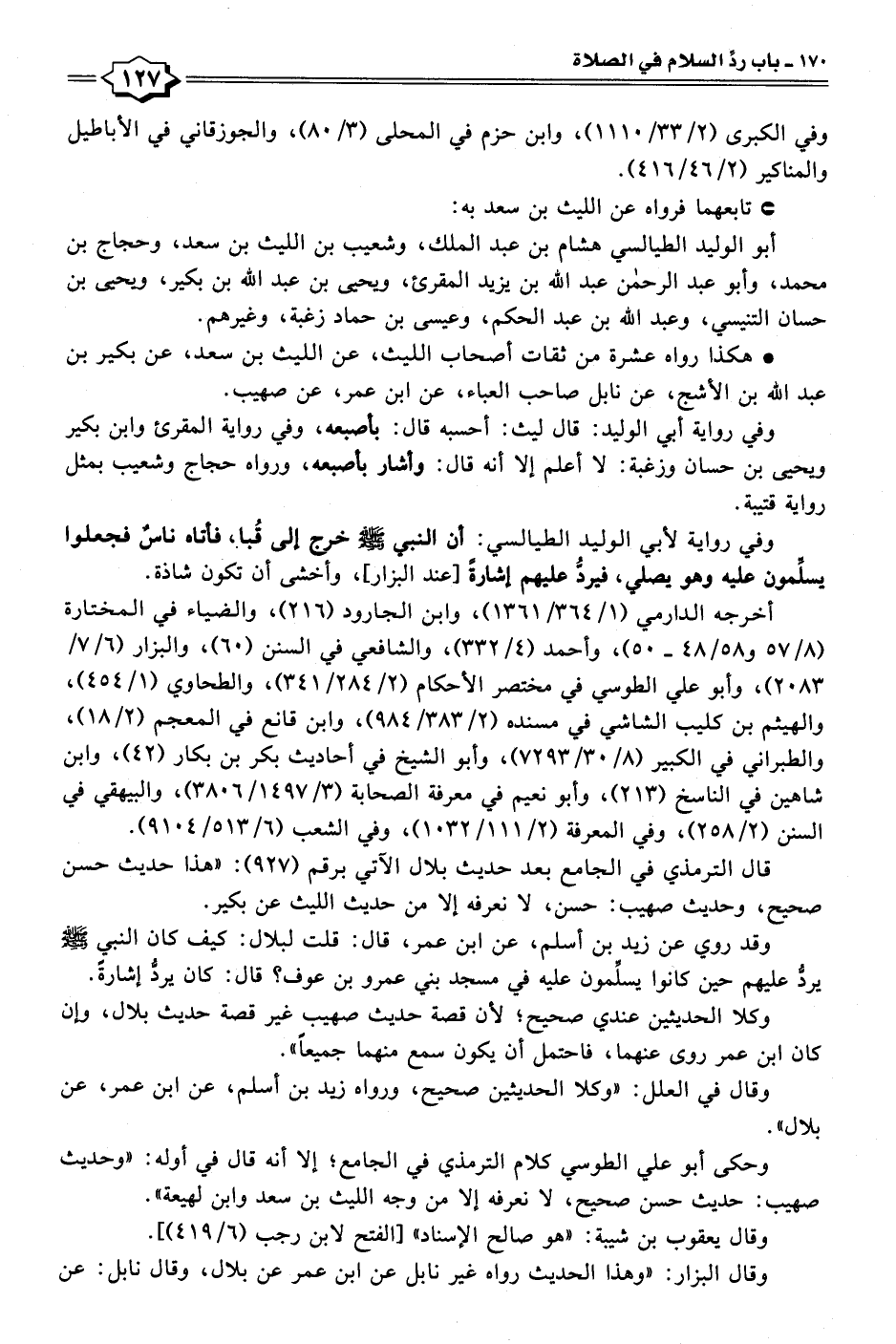 وقد روي عن زيد بن أسلم، عن ابن عمر، قال: قلت لبلال: كيف كان النبي - صلى الله عليه وسلم - يرد عليهم حين كانوا يسلِّمون عليه في مسجد بني عمرو بن عوف؟ قال: كان يرد إشارة.