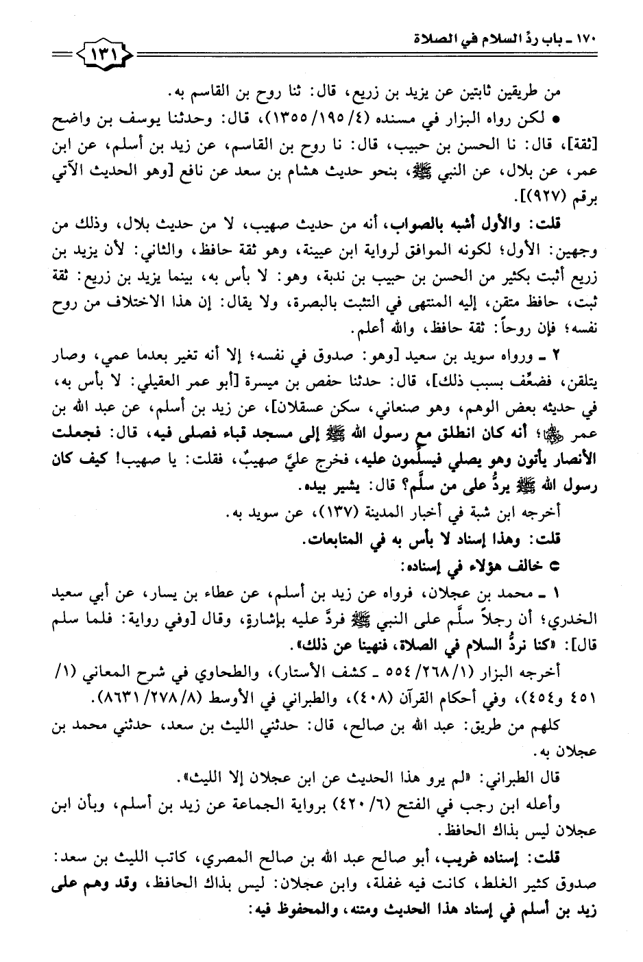 ١ - محمد بن عجلان، فرواه عن زيد بن أسلم، عن عطاء بن يسار، عن أبي سعيد الخدري؛ أن رجلًا سلَّم على النبي - صلى الله عليه وسلم - فردَّ عليه بإشارةٍ، وقال [وفي رواية: فلما سلم قال]: "كنا نردُّ السلام في الصلاة، فنهينا عن ذلك".