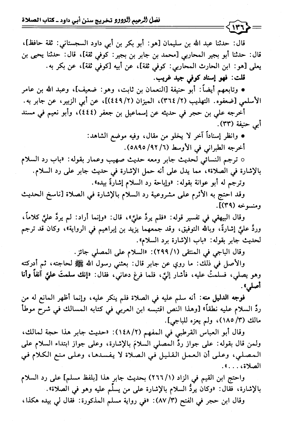 واحتج ابن القيم في الزاد (١/ ٢٦٦) بحديث جابر هذا [بلفظ مسلم] على رد السلام بالإشارة، فقال: "وكان يردُّ السلام بالإشارة على من يسلِّم عليه وهو في الصلاة".