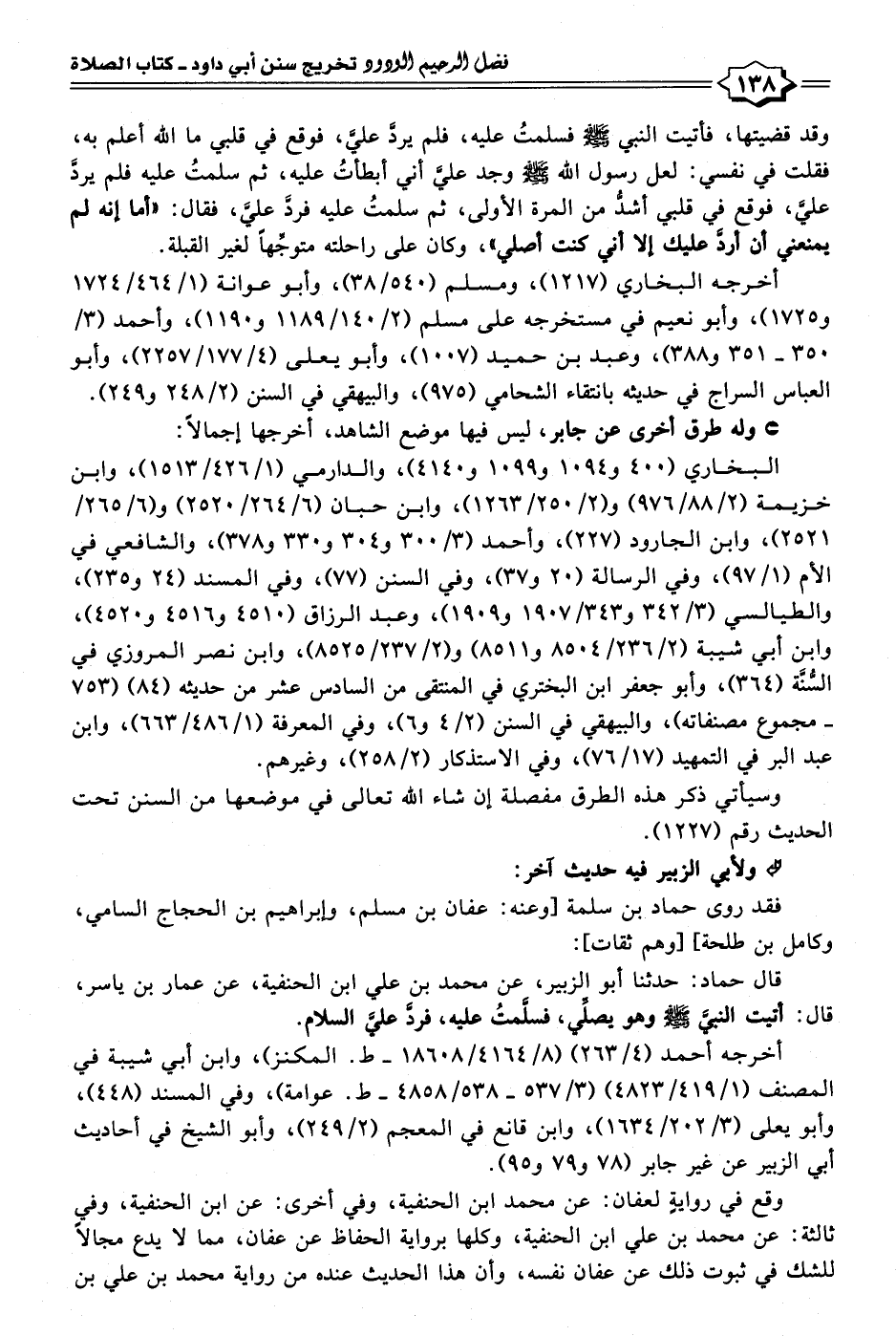 قال حماد: حدثنا أبو الزبير، عن محمد بن علي ابن الحنفية، عن عمار بن ياسر، قال: أتيت النبيَّ - صلى الله عليه وسلم - وهو يصلِّي، فسلَّمتُ عليه، فرد عليَّ السلام.