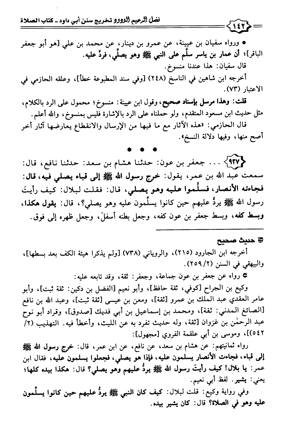 رواه ثمانيتهم: عن هشام بن سعد، عن نافع، عن ابن عمر، قال: خرج رسول الله - صلى الله عليه وسلم - إلى قباء، فجاءت الأنصار يسلمون عليه، فإذا هو يصلي، فجعلوا يسلمون عليه، فقال ابن عمر: يا بلال! كيف رأيتَ رسول الله - صلى الله عليه وسلم - يردُّ عليهم وهو يصلي؟ قال: هكذا بيده كلها؛ يعني: يشير. لفظ أبي نعيم.
