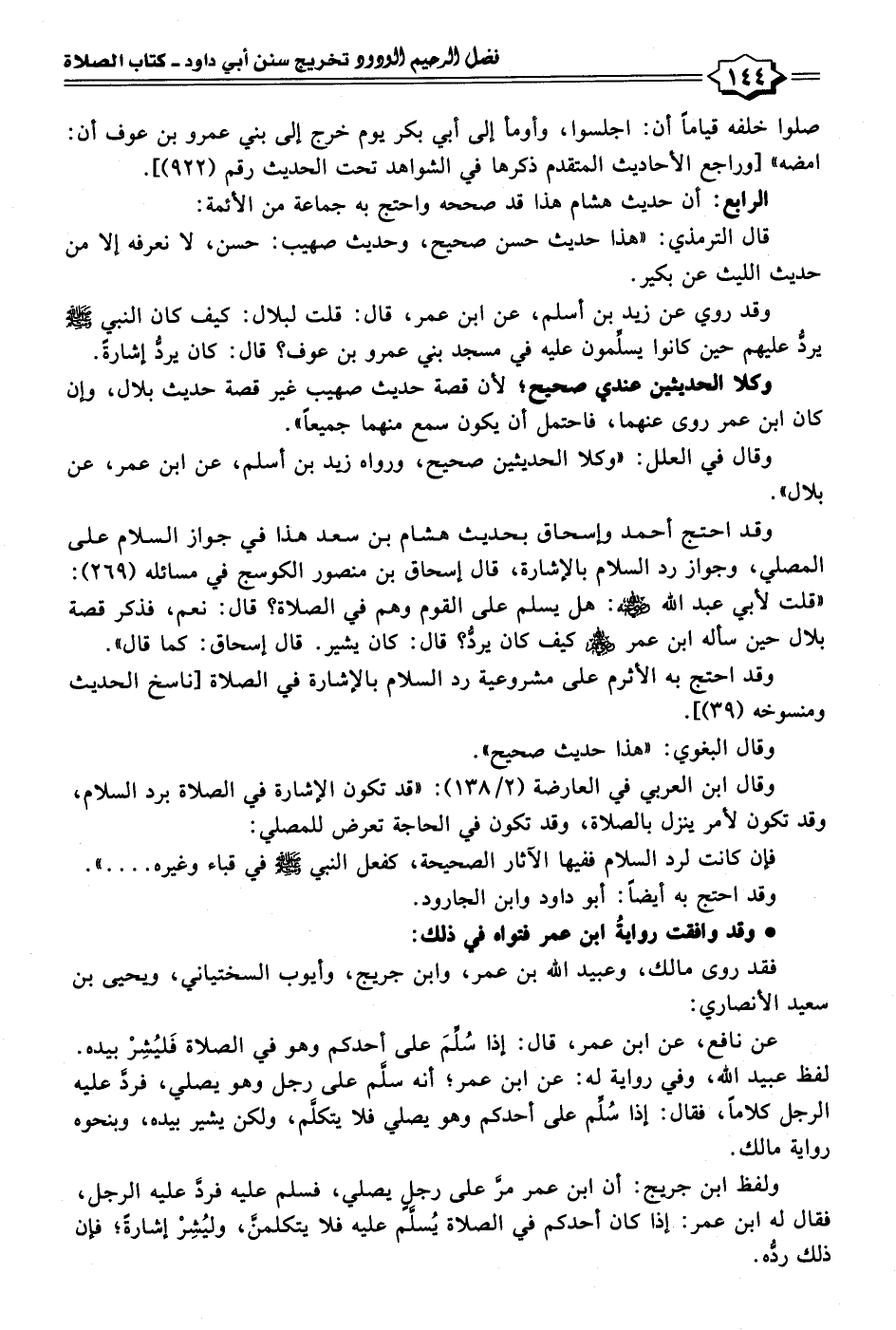 وقد احتج أحمد وإسحاق بحديث هشام بن سعد هذا في جواز السلام على المصلي، وجواز رد السلام بالإشارة، قال إسحاق بن منصور الكوسج في مسائله (٢٦٩): "قلت لأبي عبد الله - رضي الله عنه -: هل يسلم على القوم وهم في الصلاة؟ قال: نعم، فذكر قصة بلال حين سأله ابن عمر - رضي الله عنهم - كيف كان يردُّ؟ قال: كان يشير. قال إسحاق: كما قال".