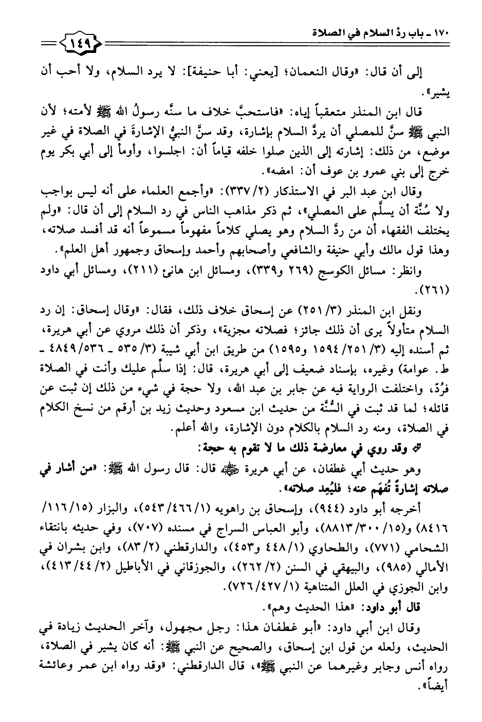 ونقل ابن المنذر (٣/ ٢٥١) عن إسحاق خلاف ذلك، فقال: "وقال إسحاق: إن رد السلام متأولًا يرى أن ذلك جائز؛ فصلاته مجزية"، وذكر أن ذلك مروي عن أبي هريرة، ثم أسنده إليه (٣/ ٢٥١/ ١٥٩٤ و ١٥٩٥) من طريق ابن أبي شيبة (٣/ ٥٣٥ - ٥٣٦/ ٤٨٤٩ - ط. عوامة) وغيره، بإسناد ضعيف إلى أبي هريرة، قال: إذا سلِّم عليك وأنت في الصلاة فرُدّ، واختلفت الرواية فيه عن جابر بن عبد الله، ولا حجة في شيء من ذلك إن ثبت عن قائله؛ لما قد ثبت في السُّنَّة من حديث ابن مسعود وحديث زيد بن أرقم من نسخ الكلام في الصلاة، ومنه رد السلام بالكلام دون الإشارة، والله أعلم.
