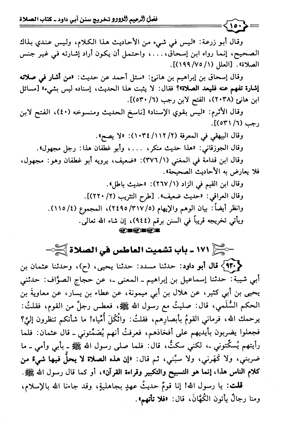 ٩٣٠ - قال أبو داود: حدثنا مسدد: حدثنا يحيى، (ح)، وحدثنا عثمان بن أبي شيبة: حدثنا إسماعيل بن إبراهيم -المعنى-، عن حجاج الصوَّاف: حدثني يحيى بن أبي كثير، عن هلال بن أبي ميمونة، عن عطاء بن يسار، عن معاويةَ بن الحكم السُّلَمي، قال: صليتُ مع رسول الله - صلى الله عليه وسلم -، فعطس رجلٌ من القوم، فقلتُ: يرحمك الله، فرماني القومُ بأبصارِهم، فقلتُ: واثُكْلَ أُمِّياه! ما شأنكم تنظرون إليَّ؟ فجعلوا يضربون بأيديهم على أفخاذهم، فعرفتُ أنهم يُصَمِّتوني -قال عثمان: فلما رأيتهم يُسكِّتوني-، لكني سكتُّ، قال: فلما صلى رسول اللّه - صلى الله عليه وسلم - -بأبي وأمي- ما ضربني، ولا كَهَرني، ولا سبَّني، ثم قال: "إن هذه الصلاة لا يحلُّ فيها شيءٌ من كلام الناس هذا، إنما هو التسبيح والتكبير وقراءة القرآن"، أو كما قال رسول الله - صلى الله عليه وسلم -.