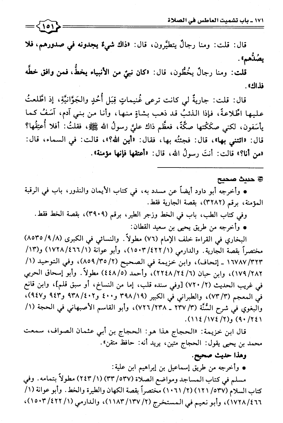 مسلم في كتاب المساجد ومواضع الصلاة (٥٣٧/ ٣٣) (١/ ٢٤٣) مطولًا بتمامه. وفي كتاب السلام (٥٣٧/ ١٢١) (٢/ ١٠٦١) مختصرًا بقصة الكهان والطيرة والخط. وأبو عوانة (١/ ٤٦٦/ ١٧٢٨)، وأبو نعيم في المستخرج (٢/ ١٣٧/ ١١٨٣)، والدارمي (١/ ٤٢٢/ ١٥٠٣)،