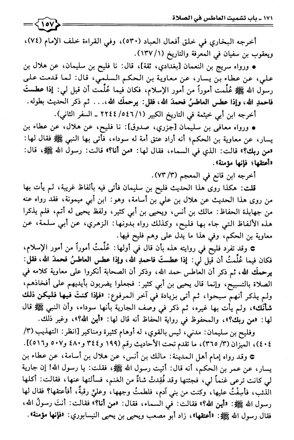 قلت: هكذا روى هذا الحديث فليح بن سليمان فأتى فيه بألفاظ غريبة، لم يأت بها من روى هذا الحديث عن هلال بن علي بن أسامة، وهو: ابن أبي ميمونة، فقد رواه عنه من جهابذة الحفاظ: مالك بن أنس، ويحيى بن أبي كثير، ولفظ يحيى له أتم، فلم يذكرا هذه الألفاظ التي جاء بها فليح، وكذلك رواه بدونها: الزهري، عن أبي سلمة، عن معاوية بن الحكم، وفي هذا ما يدل على وهم فليح فيها.