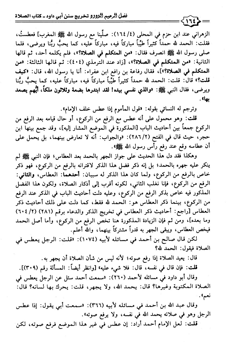 الزهراني عند ابن حزم في المحلى (٤/ ١٦٤): صلَّينا مع رسول الله - صلى الله عليه وسلم - المغرب] فعطستُ، فقلت: الحمد لله حمدًا كثيرًا طيِّبًا مباركًا فيه، مباركًا عليه، كما يحبُّ ربُّنا ويرضى، فلما صلى رسول الله - صلى الله عليه وسلم - انصرف فقال: "من المتكلم في الصلاة؟ "، فلم يكلمه أحد، ثم قالها الثانية: "من المتكلم في الصلاة؟ "، [زاد عند الترمذي (٤٠٤): ثم قالها الثالثة: "من المتكلم في الصلاة؟ "]، فقال رفاعة بن رافع ابن عفراء: أنا يا رسول الله، قال: "كيف قلت؟ " قال: قلت: الحمد لله حمدًا كثيرًا طيِّبًا مباركًا فيه، مباركًا عليه، كما يحبُّ ربُّنا ويرضى، فقال النبي - صلى الله عليه وسلم -: "والذي نفسي بيده! لقد ابتدرها بضعة وثلاثون ملكًا، أيُّهم يصعد بها".
