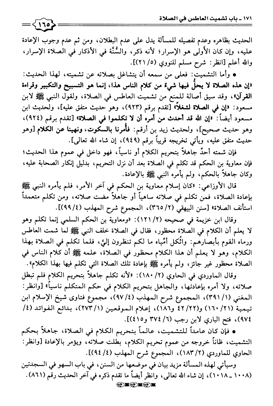 • وأما التشميت: فعلى من سمعه أن يتشاغل بصلاته عن تشميته، لهذا الحديث: "إن هذه الصلاة لا يحلُّ فيها شيءٌ من كلام الناس هذا، إنما هو التسبيح والتكبير وقراءة القرآن"، وقد سيق أصالة للمنع من تشميت العاطس في الصلاة، ولقول النبي - صلى الله عليه وسلم - لابن مسعود: "إن في الصلاة لشغلًا" [تقدم برقم (٩٢٣)، وهو حديث متفق عليه]، ولحديث ابن مسعود أيضًا: "إن الله قد أحدث من أمره أن لا تكلموا في الصلاة" [تقدم برقم (٩٢٤)، وهو حديث صحيح]، ولحديث زيد بن أرقم: فأُمرنا بالسكوت، ونهينا عن الكلام [وهو حديث متفق عليه، ويأتي تخريجه قريبًا برقم (٩٤٩)، إن شاء الله تعالى].