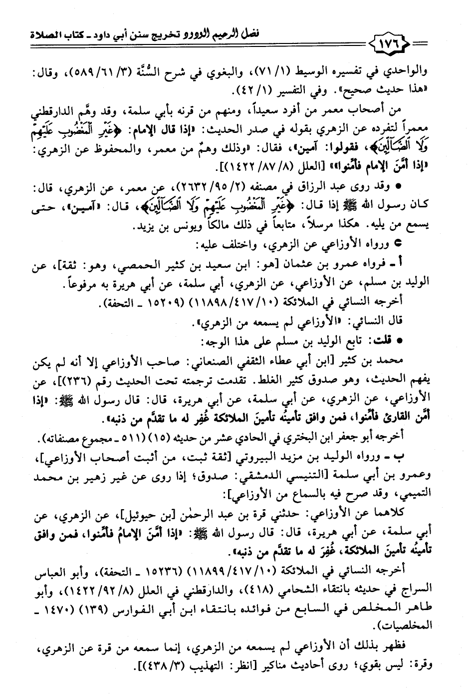 • وقد روى عبد الرزاق في مصنفه (٢/ ٩٥/ ٢٦٣٢)، عن معمر، عن الزهري، قال: كان رسول الله - صلى الله عليه وسلم - إذا قال: {غَيْرِ الْمَغْضُوبِ عَلَيْهِمْ وَلَا الضَّالِّينَ} قال: "آمين"، حتى يسمع من يليه. هكذا مرسلًا، متابعًا في ذلك مالكًا ويونس بن يزيد.
