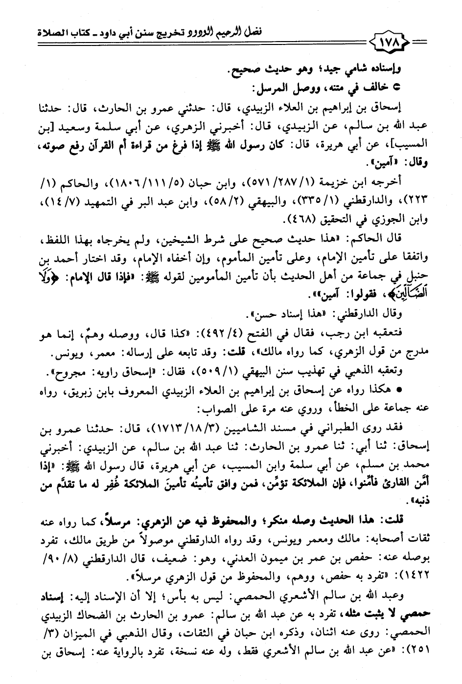 إسحاق بن إبراهيم بن العلاء الزبيدي، قال: حدثني عمرو بن الحارث، قال: حدثنا عبد الله بن سالم، عن الزبيدي، قال: أخبرني الزهري، عن أبي سلمة وسعيد [بن المسيب]، عن أبي هريرة، قال: كان رسول الله - صلى الله عليه وسلم - إذا فرغ من قراءة أم القرآن رفع صوته، وقال: "آمين".
