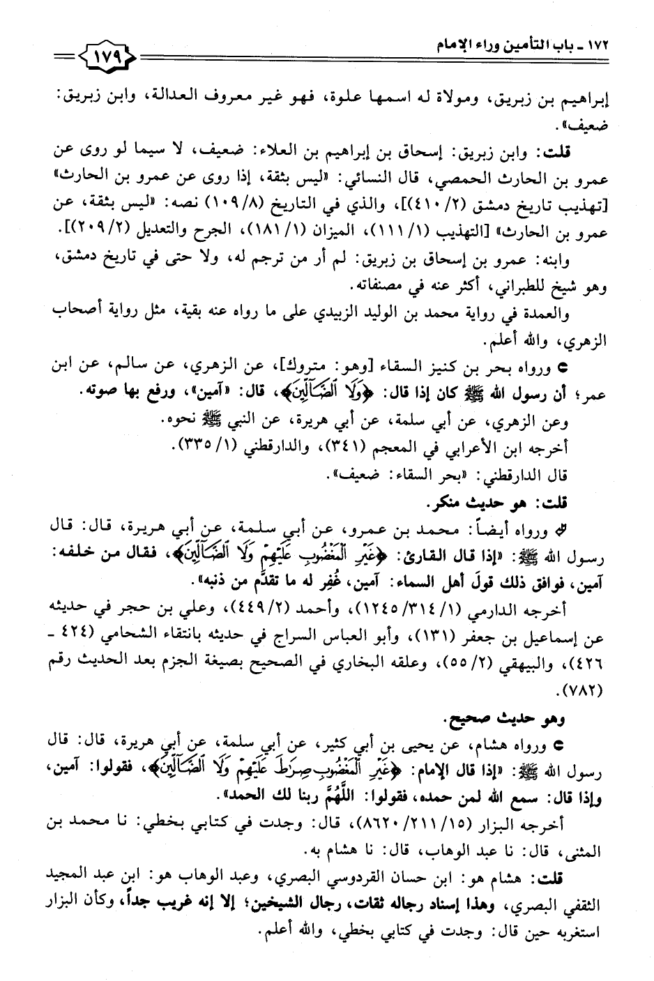 • ورواه بحر بن كنيز السقاء [وهو: متروك]، عن الزهري، عن سالم، عن ابن عمر؛ أن رسول الله - صلى الله عليه وسلم - كان إذا قال: {وَلَا الضَّالِّينَ}، قال: "آمين"، ورفع بها صوته.