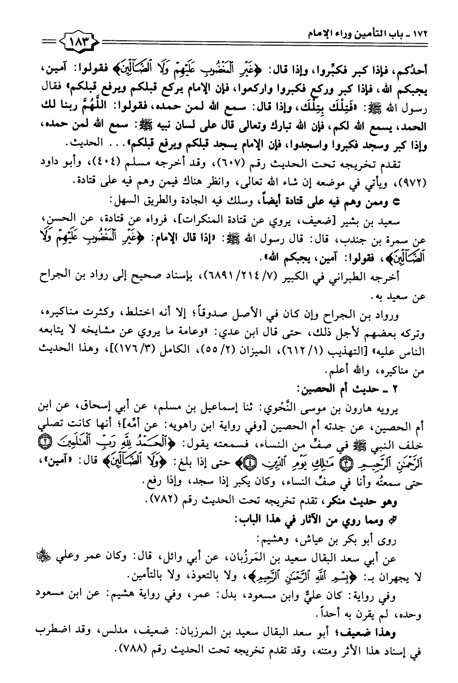 يرويه هارون بن موسى النَّحْوي: ثنا إسماعيل بن مسلم، عن أبي إسحاق، عن ابن أم الحصين، عن جدته أم الحصين [وفي رواية ابن راهويه: عن أمِّه]؛ أنها كانت تصلي خلف النبي - صلى الله عليه وسلم - في صلى من النساء، فسمعته يقول: {الْحَمْدُ لِلَّهِ رَبِّ الْعَالَمِينَ (٢) الرَّحْمَنِ الرَّحِيمِ (٣) مَالِكِ يَوْمِ الدِّينِ (٤)} حتى إذا بلغ: {وَلَا الضَّالِّينَ} قال: "آمين"، حتى سمعتُه وأنا في صفِّ النساء، وكان يكبر إذا سجد، وإذا رفع.