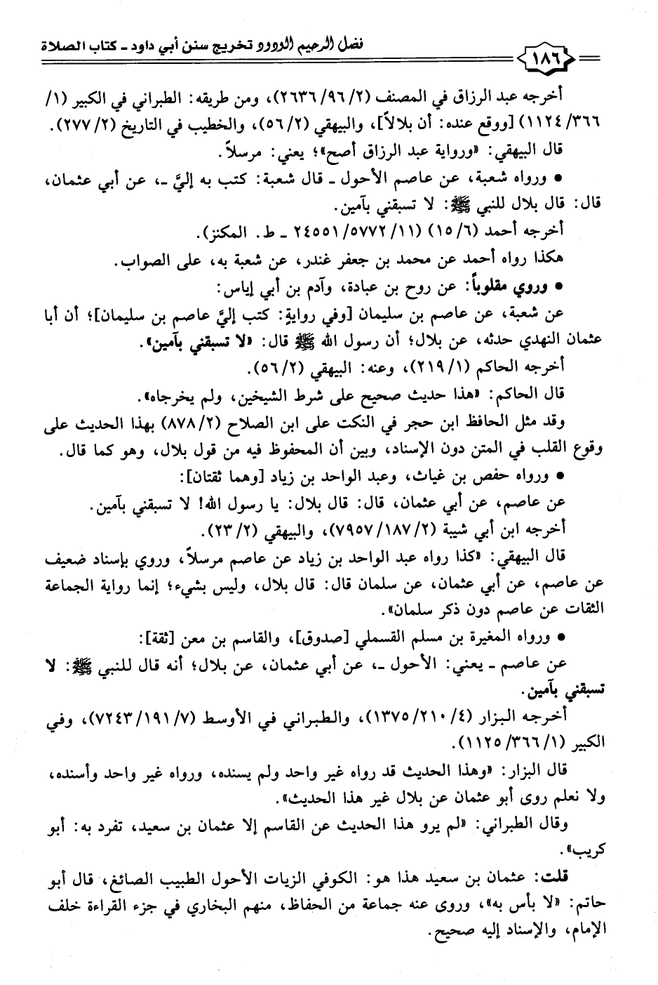 عنِ عاصم -يعني: الأحول-، عن أبي عثمان، عن بلال؛ أنه قال للنبي - صلى الله عليه وسلم -: لا تسبقني بآمين.