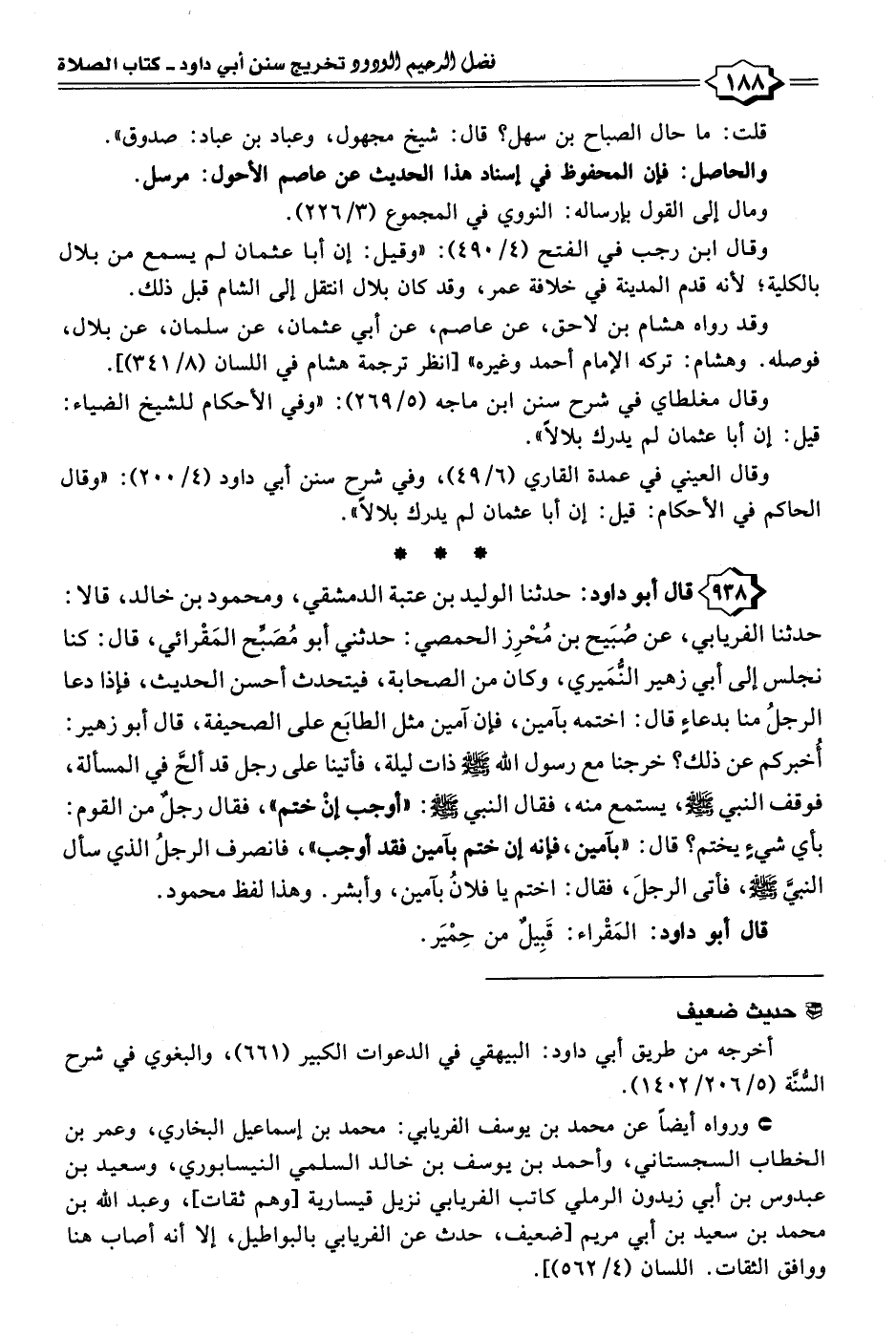 ٩٣٨ - قال أبو داود: حدثنا الوليد بن عتبة الدمشقي، ومحمود بن خالد، قالا: حدثنا الفريابي، عن صُبَيح بن مُحْرِز الحمصي: حدثني أبو مُصَبِّح المَقْرائي، قال: كنا نجلس إلى أبي زهير النُّمَيري، وكان من الصحابة، فيتحدث أحسن الحديث، فإذا دعا الرجلُ منا بدعاء قال: اختمه بآمين، فإن آمين مثل الطابَع على الصحيفة، قال أبو زهير: أُخبركم عن ذلك؟ خرجنا مع رسول الله - صلى الله عليه وسلم - ذات ليلة، فأتينا على رجل قد ألحَّ في المسألة، فوقف النبي - صلى الله عليه وسلم -، يستمع منه، فقال النبي - صلى الله عليه وسلم -: "أوجب إنْ ختم"، فقال رجل من القوم: بأي شيءٍ يختم؟ قال: "بآمين، فإنه إن ختم بآمين فقد أوجب"، فانصرف الرجلُ الذي سأل النبيَّ - صلى الله عليه وسلم -، فأتى الرجلَ، فقال: اختم يا فلانُ بآمين، وأبشر. وهذا لفظ محمود.