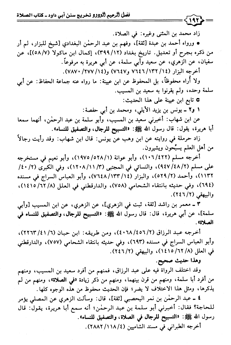 ٤ - عبد الرحمن بن نمر اليحصبي [ثقة]، قال: وسألت الزهري عن المصلي يؤمر للحاجة؟ فقال: أخبرني أبو سلمة بن عبد الرحمن؛ أنه سمع أبا هريرة، يقول: قال رسول الله - صلى الله عليه وسلم -: "التسبيح للرجال في الصلاة، والتصفيق للنساء".