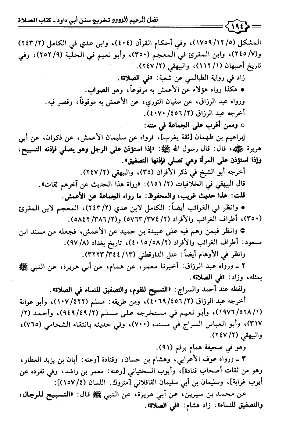 إبراهيم بن طهمان [ثقة يغرب]، فرواه عن سليمان الأعمش، عن ذكوان، عن أبي هريرة - رضي الله عنه -، قال: قال رسول الله - صلى الله عليه وسلم -: "إذا استؤذن على الرجل وهو يصلي فإذنه التسبيح، وإذا استؤذن على المرأة وهي تصلي فإذنها التصفيق".