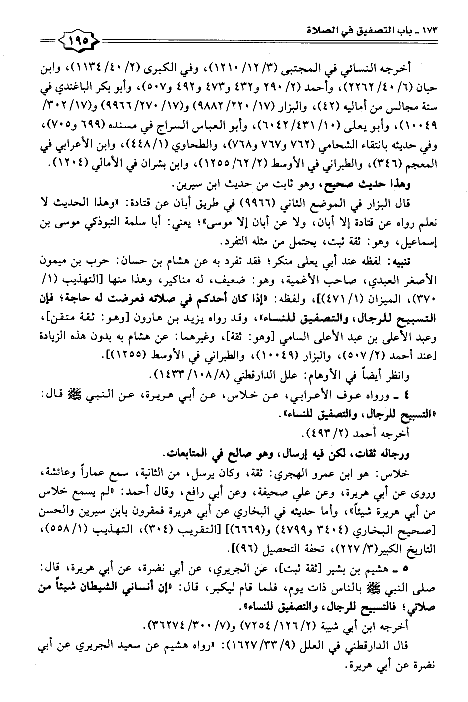 تنبيه: لفظه عند أبي يعلى منكر؛ فقد تفرد به عن هشام بن حسان: حرب بن ميمون الأصغر العبدي، صاحب الأغمية، وهو: ضعيف، له مناكير، وهذا منها [التهذيب (١/ ٣٧٠)، الميزان (١/ ٤٧١)]، ولفظه: "إذا كان أحدكم في صلاته فعرضت له حاجة؛ فإن التسبيح للرجال، والتصفيق للنساء"، وقد رواه يزيد بن هارون [وهو: ثقة متقن]، وعبد الأعلى بن عبد الأعلى السامي [وهو: ثقة]، وغيرهما: عن هشام به بدون هذه الزيادة [عند أحمد (٢/ ٥٠٧)، والبزار (١٠٠٤٩)، والطبراني في الأوسط (١٢٥٥)].
