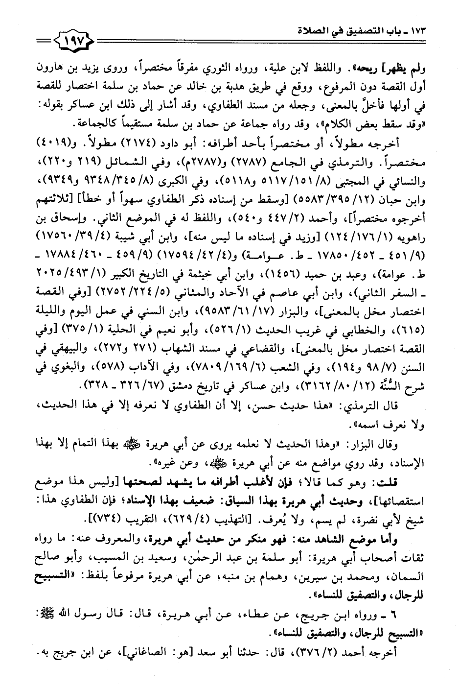 وأما موضع الشاهد منه: فهو منكر من حديث أبي هريرة، والمعروف عنه: ما رواه ثقات أصحاب أبي هريرة: أبو سلمة بن عبد الرحمن، وسعيد بن المسيب، وأبو صالح السمان، ومحمد بن سيرين، وهمام بن منبه، عن أبي هريرة مرفوعًا بلفظ: "التسبيح للرجال، والتصفيق للنساء".
