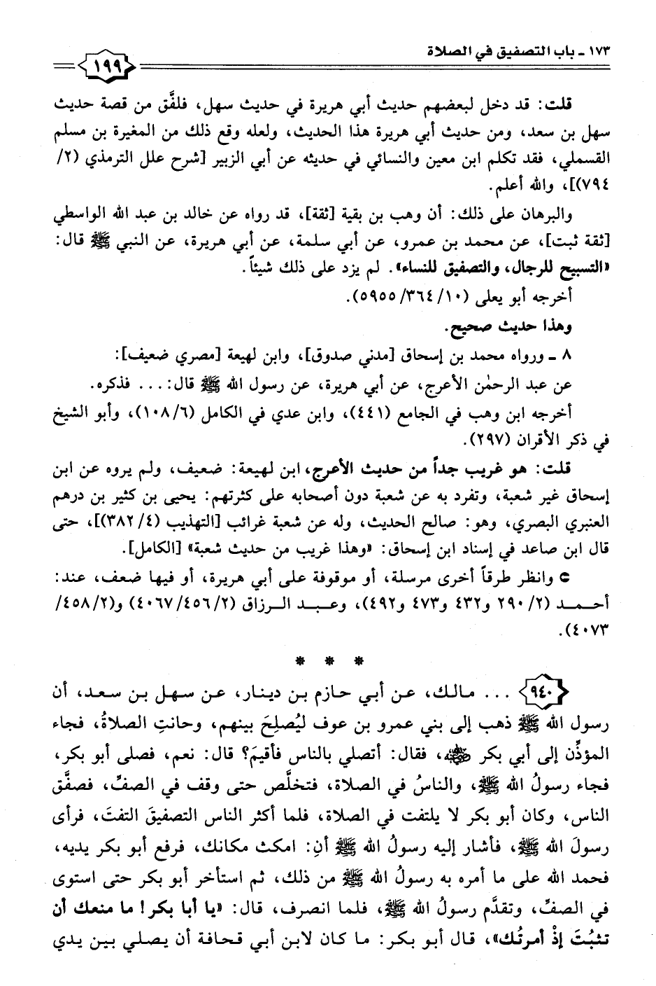 ٩٤٠ - مالك، عن أبي حازم بن دينار، عن سهل بن سعد، أن رسول الله - صلى الله عليه وسلم - ذهب إلى بني عمرو بن عوف ليُصلِحَ بينهم، وحانتِ الصلاةُ، فجاء المؤذن إلى أبي بكر - رضي الله عنه -، فقال: أتصلي بالناس فأقيمَ؟ قال: نعم، فصلى أبو بكر، فجاء رسولُ الله - صلى الله عليه وسلم -، والناسُ في الصلاة، فتخلَّص حتى وقف في الصفِّ، فصفق الناس، وكان أبو بكر لا يلتفت في الصلاة، فلما أكثر الناس التصفيقَ التفتَ، فرأى رسولَ الله - صلى الله عليه وسلم -، فأشار إليه رسولُ الله - صلى الله عليه وسلم - أنِ: امكث مكانك، فرفع أبو بكر يديه، فحمد الله على ما أمره به رسولُ الله - صلى الله عليه وسلم - من ذلك، ثم استأخر أبو بكر حتى استوى في الصفِّ، وتقدَّم رسولُ الله - صلى الله عليه وسلم -، فلما انصرف، قال: "يا أبا بكر ما منعك أن تثبُتَ إذْ أمرتُك"، قال أبو بكر: ما كان لابن أبي قحافة أن يصلي بين يدي
