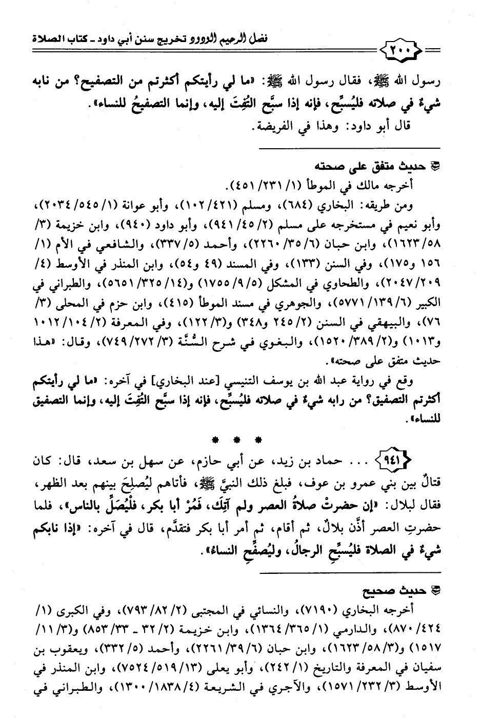 ٩٤١ - . . . حماد بن زيد، عن أبي حازم، عن سهل بن سعد، قال: كان قتالٌ بين بني عمرو بن عوف، فبلغ ذلك النبي - صلى الله عليه وسلم -، فأتاهم ليُصلِحَ بينهم بعد الظهر، فقال لبلال: "إن حضرتْ صلاةُ العصر ولم آتِكَ، فَمُرْ أبا بكر، فلْيُصَلِّ بالناس"، فلما حضرتِ العصر أذَّن بلالٌ، ثم أقام، ثم أمر أبا بكر فتقدَّم، قال في آخره: "إذا نابكم شيءٌ في الصلاة فليُسبِّحِ الرجالُ، وليُصفحِ النساء".