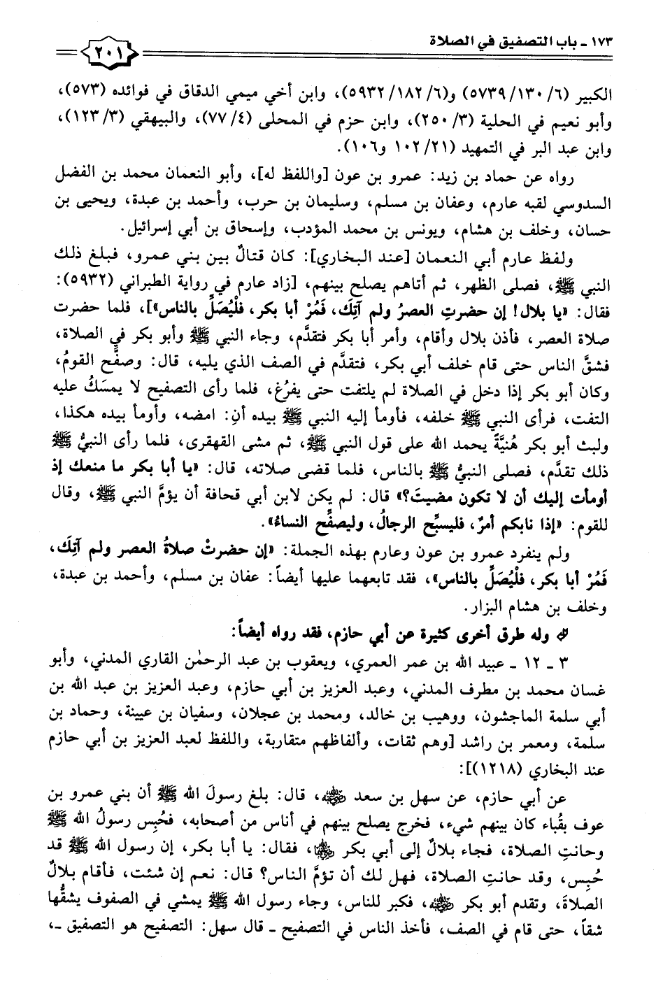عن أبي حازم، عن سهل بن سعد - رضي الله عنه -، قال: بلغ رسولَ الله - صلى الله عليه وسلم - أن بني عمرو بن عوف بقُباء كان بينهم شيء، فخرج يصلح بينهم في أناس من أصحابه، فحُبِس رسولُ الله - صلى الله عليه وسلم - وحانتِ الصلاة، فجاء بلالٌ إلى أبي بكر - رضي الله عنهما -، فقال: يا أبا بكر، إن رسول الله - صلى الله عليه وسلم - قد حُبِس، وقد حانتِ الصلاة، فهل لك أن تؤمَّ الناس؟ قال: نعم إن شئت، فأقام بلالٌ الصلاةَ، وتقدم أبو بكر - رضي الله عنه -، فكبر للناس، وجاء رسول الله - صلى الله عليه وسلم - يمشي في الصفوف يشقُّها شقًا، حتى قام في الصف، فأخذ الناس في التصفيح -قال سهل: التصفيح هو التصفيق-،