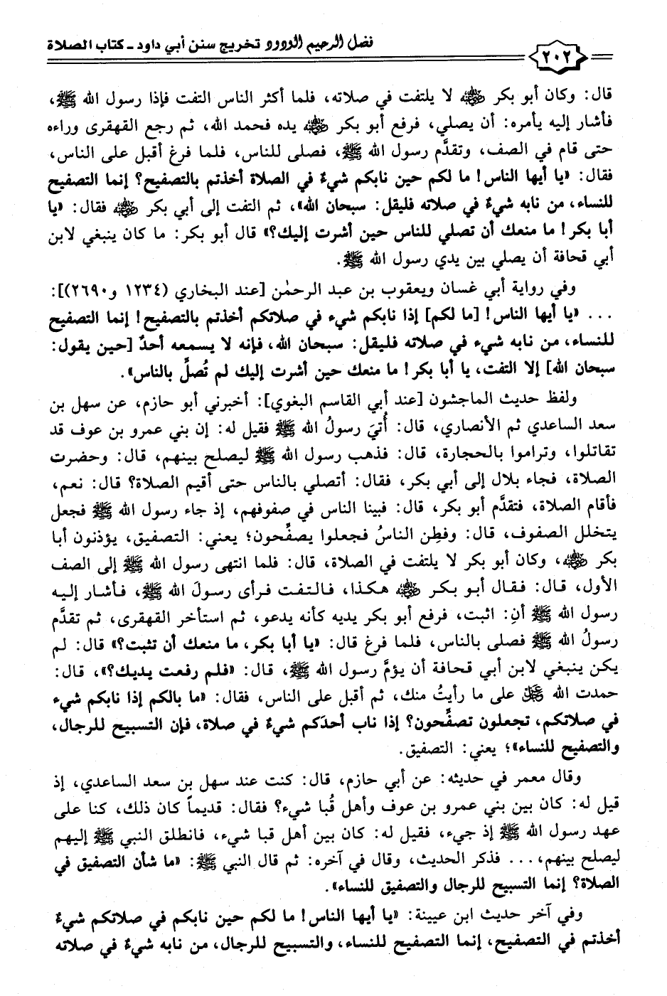 وفي رواية أبي غسان ويعقوب بن عبد الرحمن [عند البخاري (١٢٣٤ و ٢٦٩٠)]:. . . "يا أيها الناس! [ما لكم] إذا نابكم شيء في صلاتكم أخذتم بالتصفيح! إنما التصفيح للنساء، من نابه شيء في صلاته فلبقل: سبحان الله، فإنه لا يسمعه أحدٌ [حين يقول: سبحان الله] إلا التفت، يا أبا بكر! ما منعك حين أشرت إليك لم تُصلِّ بالناس".