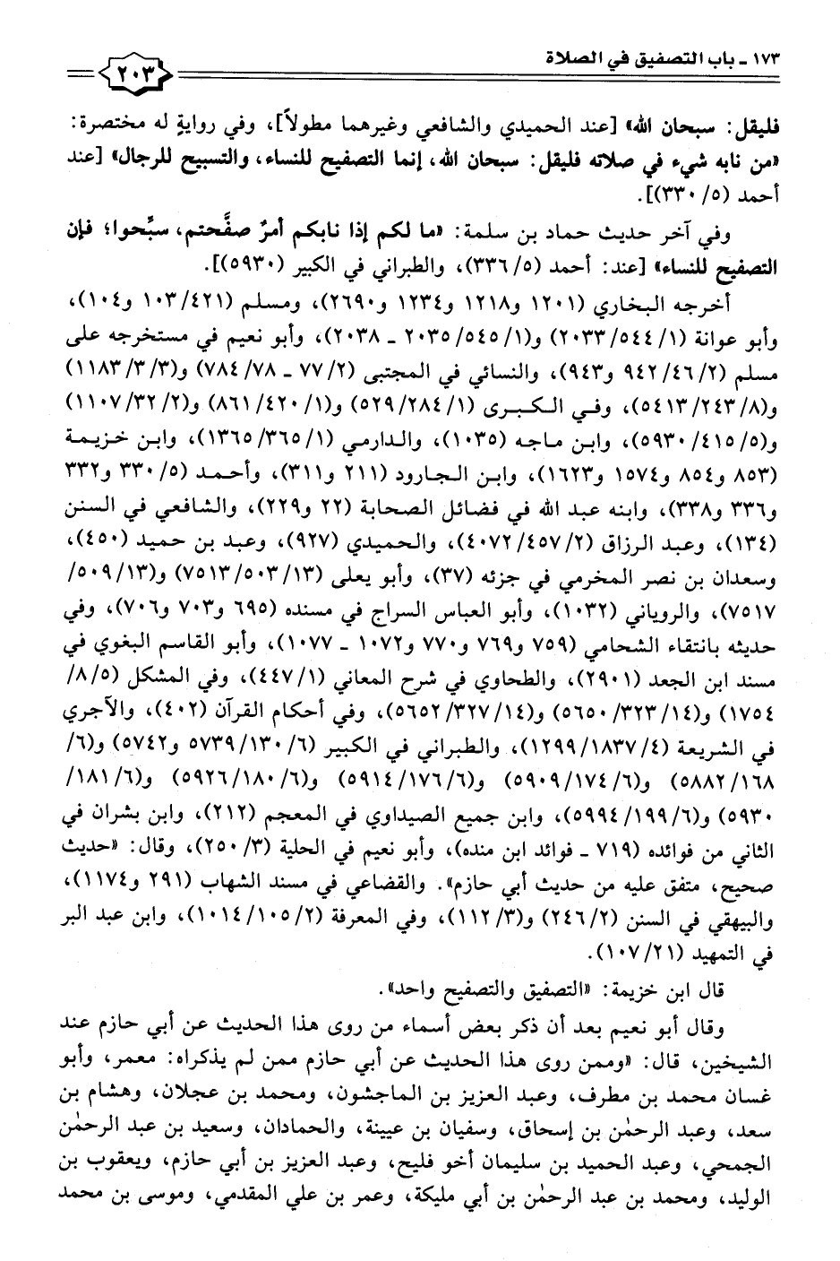 وفي آخر حديث حماد بن سلمة: "ما لكم إذا نابكم أمرٌ صفَّحتم، سبَّحوا؛ فإن التصفيح للنساء" [عند: أحمد (٥/ ٣٣٦)، والطبراني في الكبير (٥٩٣٠)].