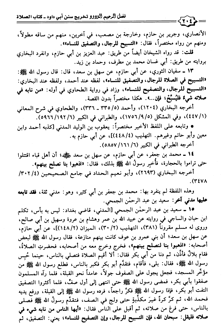 ١٥ - سعيد بن عبد الرحمن الجمحي [المدني، قاضي بغداد: ليس به بأس، تكلم ابن حبان والساجي في روايته عن عبيد الله بن عمر وهشام بن عروة وسهيل بن أبي صالح، وروى له مسلم مقرونًا (٣٨١)، التهذيب (٢/ ٣٠)، الميزان (٢/ ١٤٨)]، عن أبي حازم، عن سهل بن سعد؛ أن بني عمرو بن عوف كانت بينهم منازعة، فقال رسول الله - صلى الله عليه وسلم - لبعض أصحابه: "اذهبوا بنا لنصلح بينهم"، فخرج وخرج معه من أصحابه، فحضرتِ الصلاةُ، فقام بلالٌ فأذَّن، ثم دنا من أبي بكر فقال: ألا أقيم الصلاة فتصلي بالناس، حينما حُبِس رسول الله - صلى الله عليه وسلم -، فقال: بلى، فأقام، فتقدَّم أبو بكر فكبر بالناس، فطلع رسول الله - صلى الله عليه وسلم - من مؤَخَّر المسجد، فجعل يجول على الصفوف جولًا، عامدًا نحو القبلة، فلما رآه المسلمون صفقوا بأبي بكر، فمضى رسول الله - صلى الله عليه وسلم - حتى انتهى إلى أول صفٍّ، فلما أكثروا التصفيق التفت أبو بكر، فإذا رسول الله - صلى الله عليه وسلم - فكرَّ راجعًا، فرده رسول الله - صلى الله عليه وسلم - إلى القبلة، ورفع يديه فحمد الله، ثم كرَّ كرةً غيرَ مكذَّبةٍ حتى ولج في الصف، فتقدَّم رسولُ الله - صلى الله عليه وسلم - فصلى بالناس، حتى فرغ من صلاته، ثم أقبل على الناس فقال: "أيها الناس من نابه شيء في صلاته فليقل: سبحان الله، فإن التسببح للرجال، وإن التصفيح للنساء"؛ يعني: التصفيق، ثم