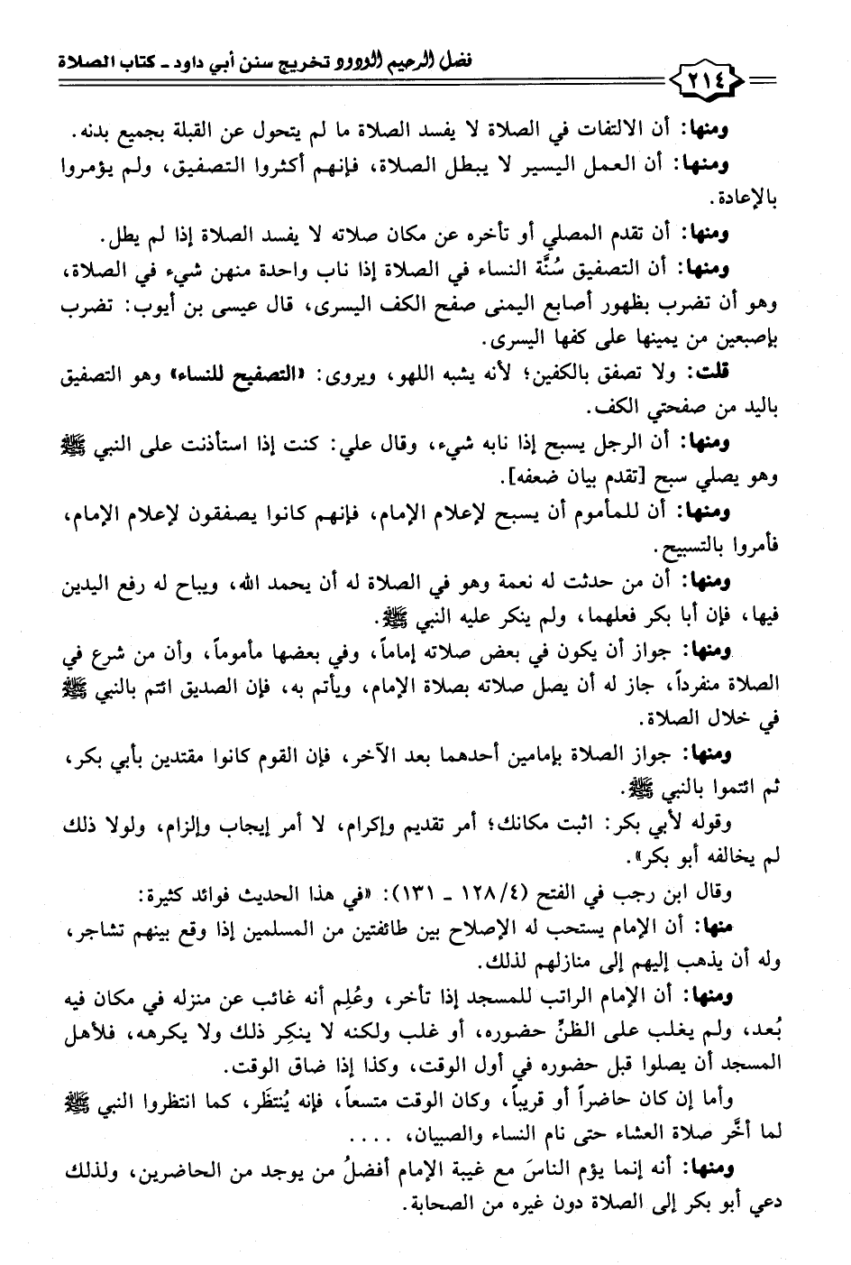 ومنها: أن الرجل يسبح إذا نابه شيء، وقال علي: كنت إذا استأذنت على النبي - صلى الله عليه وسلم - وهو يصلي سبح [تقدم بيان ضعفه].