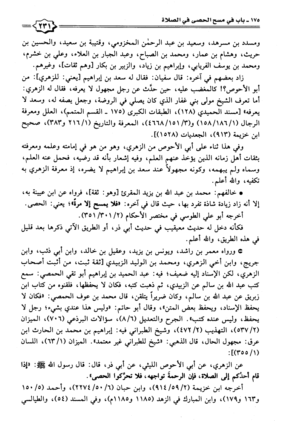 زاد بعضهم في آخره: قال سفيان: فقال له سعد بن إبراهيم [يعني: للزهري]: من أبو الأحوص؟! كالمغضب عليه، حين حدَّث عن رجل مجهول لا يعرفه، فقال له الزهري: أما تعرف الشيخ مولى بني غفار الذي كان يصلي في الروضة، وجعل يصفه له، وسعد لا يعرفه" [مسند الحميدي (١٢٨)، الطبقات الكبرى (١٧٥ - القسم المتمم)، العلل ومعرفة الرجال (١/ ١٨٦/ ١٥٨) و (٣/ ١٥١/ ٤٦٦٨)، المعرفة والتاريخ (١/ ٢١٦ و ٣٨٣)، صحيح ابن خزيمة (٩١٣)، الجعديات (١٥٢٨)].