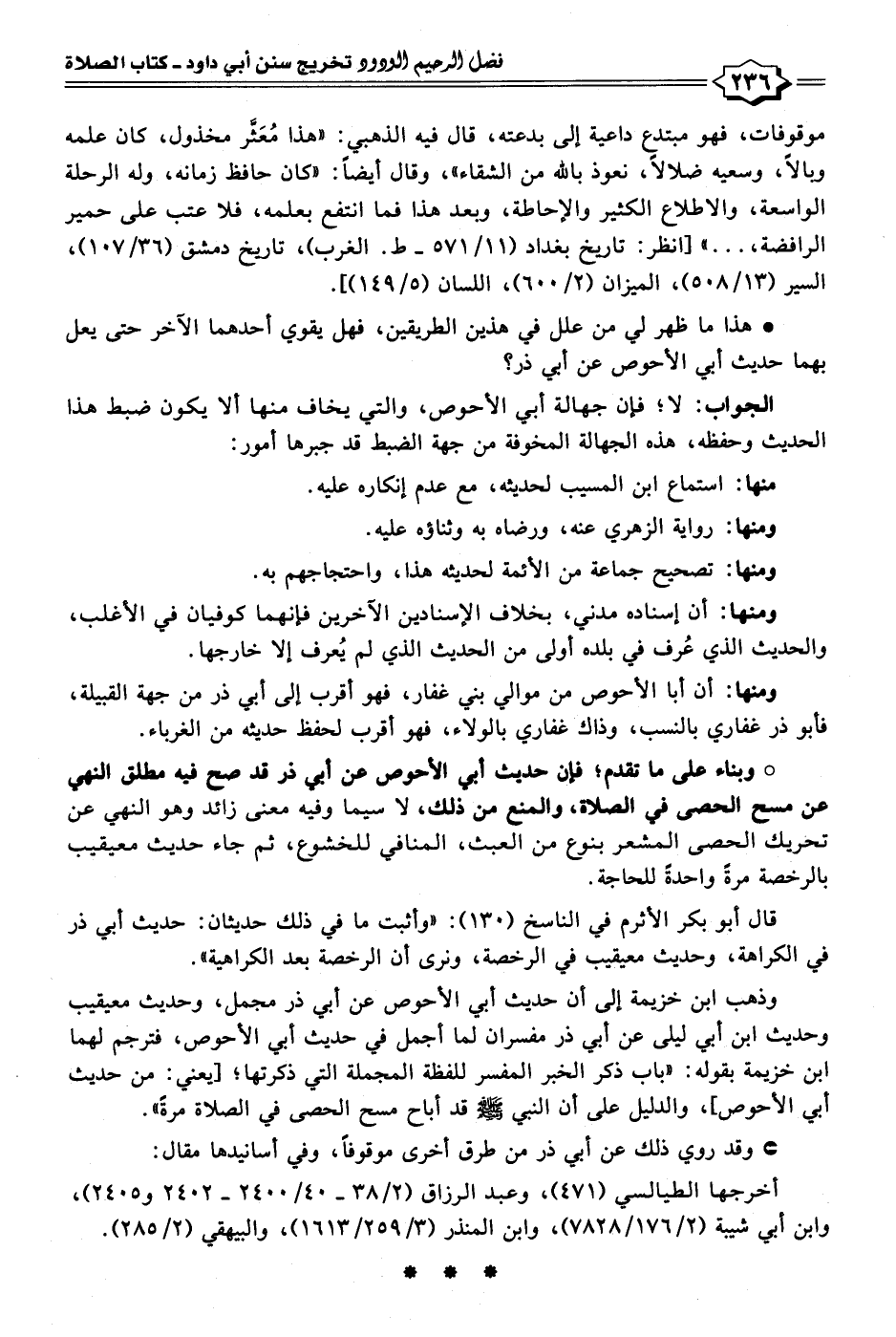 • وبناء على ما تقدم؛ فإن حديث أبي الأحوص عن أبي ذر قد صح فيه مطلق النهي عن مسح الحصى في الصلاة والمنع من ذلك، لا سيما وفيه معنى زائد وهو النهي عن تحريك الحصى المشعر بنوع من العبث، المنافي للخشوع، ثم جاء حديث معيقيب بالرخصة مرةً واحدةً للحاجة.
