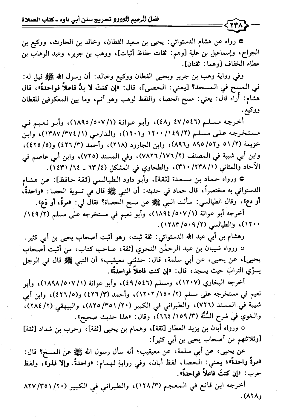وفي رواية وهب بن جرير ويحيى القطان ووكيع وخالد: أن رسول الله - صلى الله عليه وسلم - قيل له: في المسح في المسجد؟ [يعني: الحصى]، قال: "إن كنتَ لا بدَّ فاعلًا فواحدةً"، قال هشام: أُراه قال: يعني: مسح الحصا، واللفظ لوهب وهو أتم، وما بين المعكوفين للقطان ووكيع.